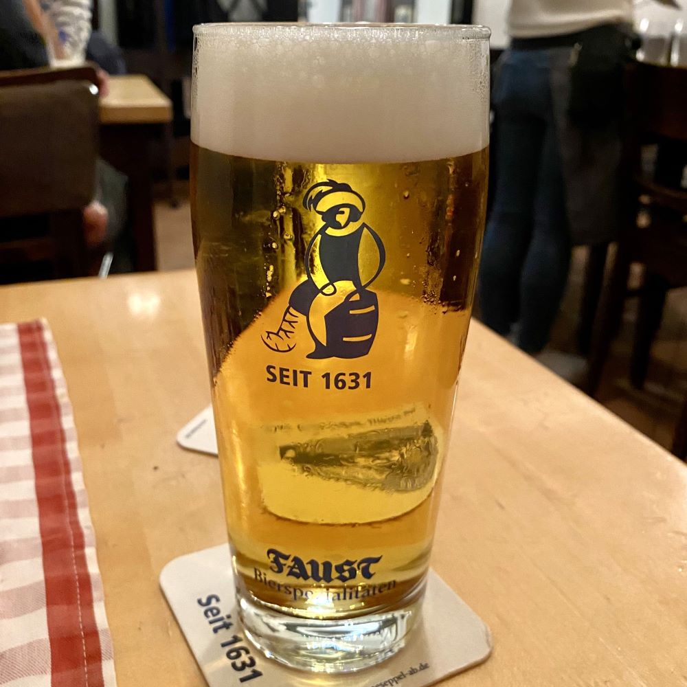 Am frühen Abend drängte es mich natürlich in eine Restauration. Wunschziel war das seit 1411 bezeugte Gasthaus Zum Riesen, wo u. a. das vom Brauhaus Faust eigens für dieses Gasthaus gebraute Riesen-Spezial im Ausschank ist. Aber nichts zu machen. Alle Tische bereits belegt oder reserviert. Auch in weiteren Lokalen wie dem Kalt-Loch Bräustüble oder dem Brezel Wirt hätte ich reservieren oder geduldig warten müssen. Mehr als genug Platz hatte dagegen die Goldene Krone. Das hatte natürlich Gründe und die Speisekarte gab ein erstes Indiz. Alles ein paar Euro teurer als bei der Konkurrenz. Aber gut, vielleicht sind hier die Portionen größer oder die Küche bereitet sie besonders raffiniert zu.