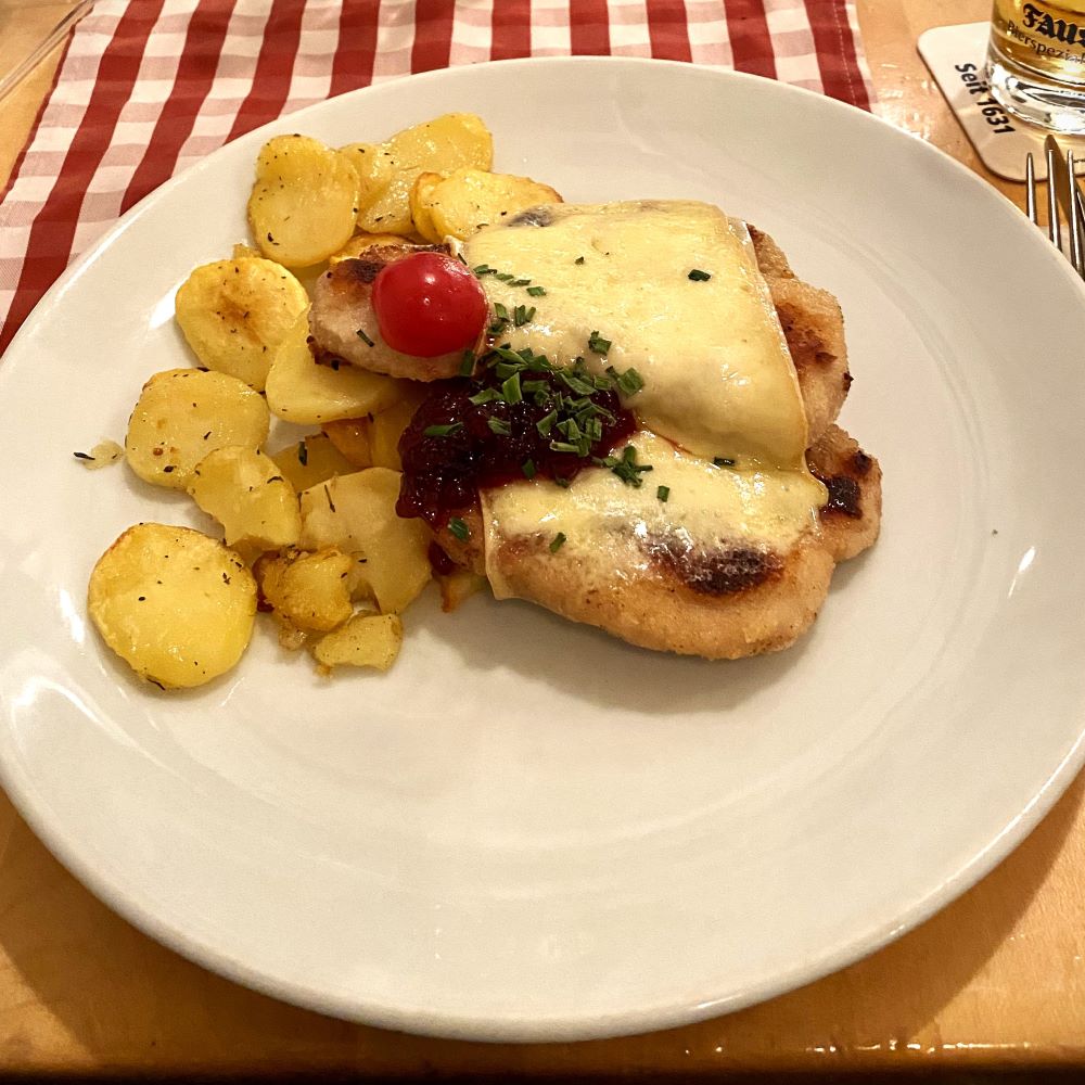 Für mich ging es nach Abpfiff schnurstracks zurück in die Altstadt und dort kehrte ich für ein spätes, aber dringend benötigtes Abendessen in die Brauereigaststätte Schlappeseppel ein. Schließlich hatte das Bier gleichen Namens im Stadion gemundet und eine warme Mahlzeit würde ich dort garantiert selbst gegen 22 Uhr noch bekommen. Allerdings musste ich zunächst einmal einen freien Platz ergattern. Zum Glück waren nach kurzer Wartezeit gleich mehrere Gäste in Aufbruchstimmung und alsbald hatte ich ein Bier und ein Bierschnitzel auf einem just abgeräumten Tisch stehen. Das Schnitzel war in Sachen Fleisch und Panade gut, jedoch hätte man durchaus großzügiger mit dem Bierkäse sein dürfen und die Bratkartoffeln waren ziemlich fad.