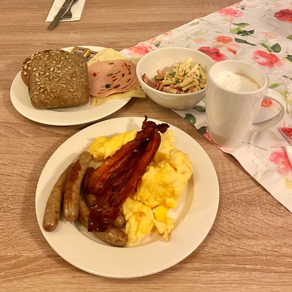 Ich beließ es vorerst bei einem Wirtshaus und schlenderte zur Geisterstunde zurück zum Hotel. Nach acht Stunden Nachtruhe wachte ich in einem verregneten Aschaffenburg auf und schlenderte sogleich zum Frühstücksbuffet. Außer Brötchen und Aufschnitt, schnappte ich mir auch einen Teller mit warmen Deftigkeiten. Wurst- und Käsesalat wollte ich ebenfalls nicht unprobiert lassen. Es gab insgesamt eine richtig große Auswahl von süß bis herzhaft und das Personal war emsig beim Wiederauffüllen. Aber da selbst mein Magenvolumen irgendwann an seine Grenzen stößt, konnte ich leider nicht alles probieren.