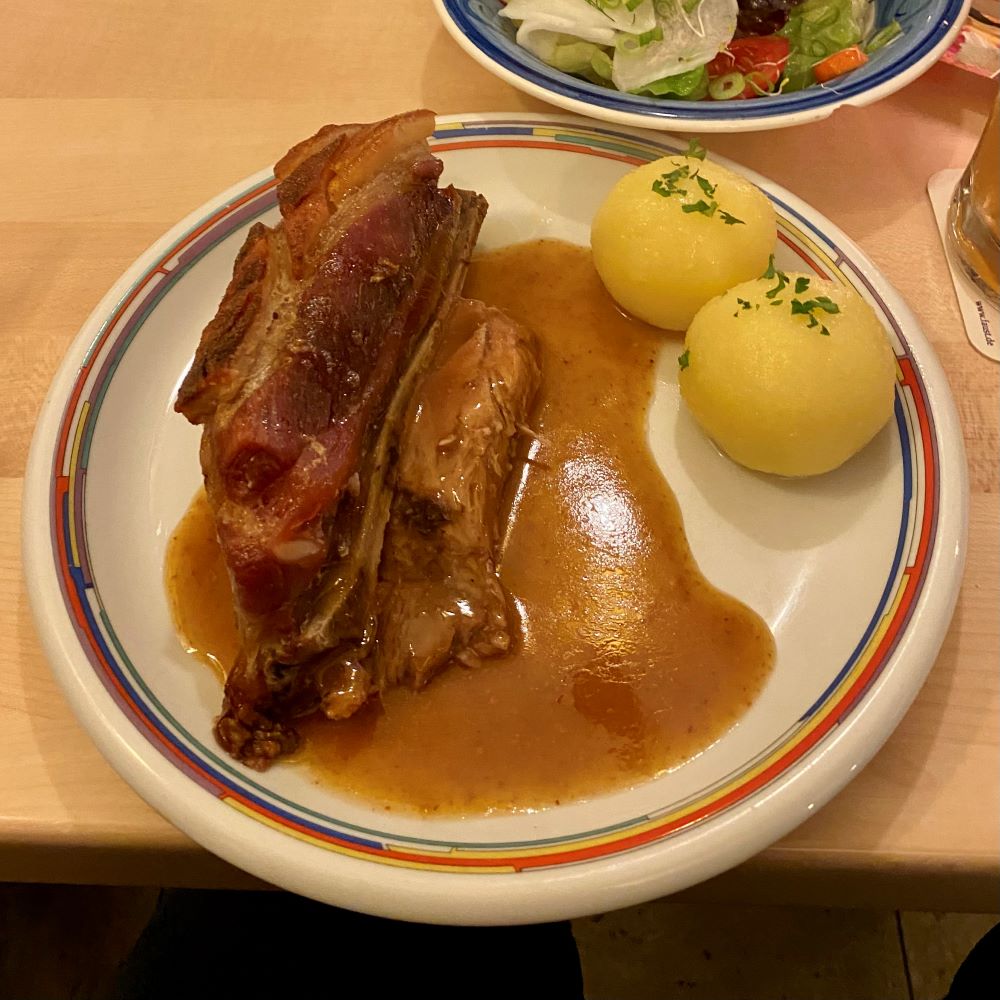 Empfohlen wurde mir das Schäuferla mit Kartoffelklößen und Begleitblattsalat für 20,80 €. Außer dass es mindestens 5 € zu teuer erschien und die beiden Klöße mutmaßlich nicht hausgemacht waren, konnte ich nicht meckern. Das Fleisch war zart und die Kruste schön knusprig. Das Kellerbier von Schlappeseppel (0,5 l für 4,90 €) mundete natürlich auch und mittlerweile hat man sich inflationsbedingt an bis zu 5 € für den Halben gewöhnt. Neugierig schaute im Anschluss meines Besuchs dennoch in die Bewertungen der Goldenen Krone bei Google und war äußerst amüsiert. Natürlich wurde von vielen das Preis-Leistungs-Verhältnis bemängelt und auch das in die Jahre gekommene Interieur kam nicht gut weg. Oft fiel der Begriff Touri-Falle. Die Krönung des Ganzen sind allerdings die langen und derben Repliken des Wirtes. Unbedingter Lesetipp! Das ist zwar auch alles andere als Werbung für das Gasthaus, aber ganz großes Kino. Toppt meines Erachtens sogar Hardy Diemel vom Bobhaus Winterberg (mein bisheriger Lieblingsakteur in Sachen Rezensionsrepliken auf Google).