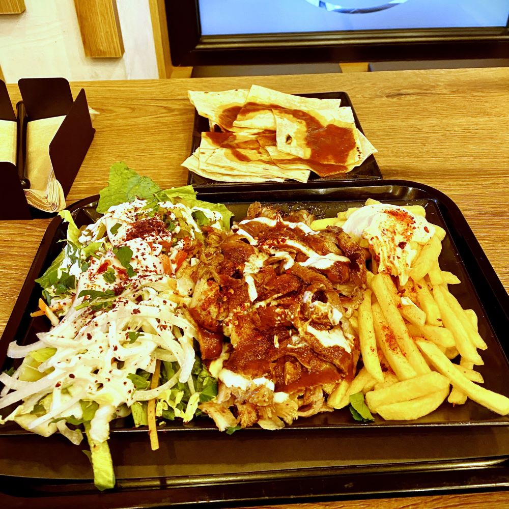 Ich fuhr kurz darauf mit der nächsten S-Bahn nach Mannheim und hatte dort noch Zeit für ein Abendessen beim Dönergrill KATIK. Es gab das würzige Fleisch vom Drehspieß zusammen mit Salat, Sauce, Brot und Pommes für 12 € als Tellergericht. Für die Heimfahrt hatte ich anschließend den ICE um 18:32 Uhr auserkoren. Ein paar mit Weißweinflaschen bewaffnete Blau-Gelbe waren leider im selben Zug. Aber im Ruheabteil hatte man in der Tat seine Ruhe vor denen und gute drei Stunden später war ich zurück im schönen Hildesheim.