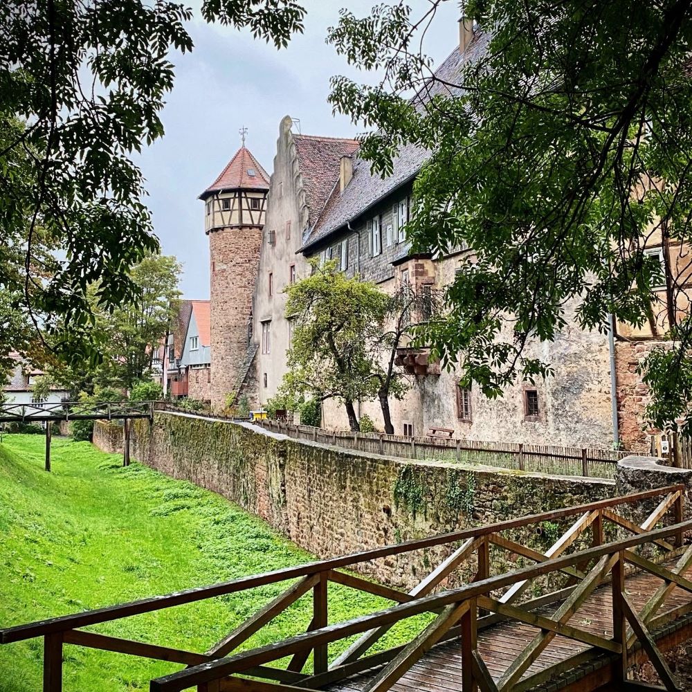 Am Sonntagmorgen kam es schließlich zum Wendepunkt auf meiner Reise. Ich hatte nun neben Michelstadt noch Hirschhorn am Neckar und Mosbach auf meinem Tourplan stehen. Doch heute sollte es in der ganzen Region den ganzen Tag noch heftiger als am Vortag schütten. Bereits bei meinem morgendlichen Spaziergang durch die Altstadt von Michelstadt hatte ich die Schnauze voll. Zumal nicht nur die Nässe so langsam die Kleidung bis auf die Haut durchdrang, sondern die Buden und Bühnen des Weinbrunnen- und Kirchweihfest obendrein die Sichtachsen für meine obligatorischen Architekturfotos störten.