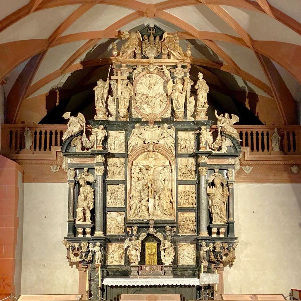 Im Jahre 1552 wurde im Zweiten Markgräflerkrieg (1552 – 1554) die mittelalterliche Johannisburg zerstört. An dieser Stelle ließ Kurfürst und Erzbischof Johann Schweikhard von Cronberg nun zwischen 1605 und 1619 das heute von mir besichtigte Schloss Johannisburg im Stile der Renaissance errichten. Von der alten Burg blieb lediglich der gotische Bergfried erhalten, der in dem nahezu quadratischen Bauwerk (87,5 x 86 m Grundriss) die vier Ecktürme ergänzt. Die Symmetrie des Bauwerks ist bis heute beeindruckend und im Inneren warten neben der stadt- und schlossgeschichtlichen Ausstellung diverse Kunstschätze auf den Besucher. U. a. eine Cranach-Sammlung, Paramente der Mainzer Erzbischöfe oder auch die weltweit größte Sammlung von Modellbauten aus Kork (vorwiegend antike Bauwerke). Letztere ist dem Hofkonditor Carl Joseph May und dessen Sohn Georg zu verdanken, die ab 1792 diesem Hobby nachgingen. Am meisten fesselte mich jedoch der Hochaltar der Schlosskapelle. Dieser wurde zwischen 1609 und 1614 von Hans Juncker geschaffen. Der Altar aus Marmor ist von 150 detailreichen Figuren aus Alabaster geschmückt.