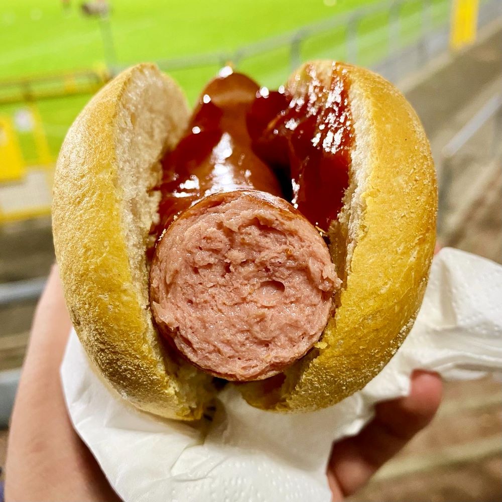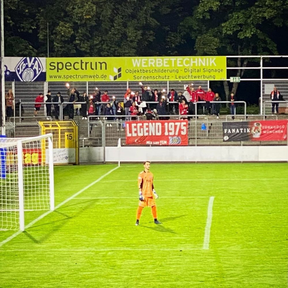 In der Pause gönnte ich mir eine Rindswurst im Brötchen (3,50 €) und ein Helles (Schlappeseppel, 4 € für 0,5 l). Da die letzte Mahlzeit schon zwölf Stunden zurücklag, war die Wurst schnell verdrückt, während ich in der 2.Halbzeit noch ein wenig am Bier nippen konnte. Als SVA-Fan wäre ich nun Gefahr gelaufen mich am Gerstensaft zu verschlucken. Denn der 1975 von türkischen Migranten gegründete Gastverein markierte bereits in der 49.Minute durch Maximilian Berwein den Ausgleich. Zwölf Minuten später war die Partie gedreht. Man of the Match Berwein legte seinem Mitspieler Yannick Woudstra das 1:2 auf. Große Freude bei den ca. 50 mitgereisten Münchnern. Überhaupt sorgte der Türkgücü-Anhang während des Spiels zumindest sporadisch für ein paar Gesänge und Schlachtrufe.