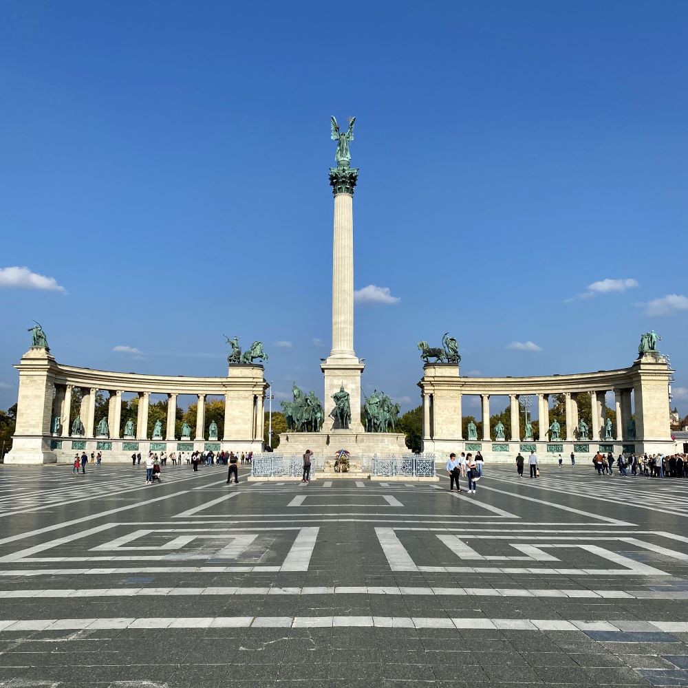 Den Heldenplatz kannte ich bereits illuminiert bei Nacht (siehe Budapest 02/2020), aber tagsüber macht er ebenfalls eine gute Figur. 1896, als die Magyaren das tausendjährige Jubiläum ihrer Landnahme in Ungarn feierten, beschloss man am östlichen der Ende der Pester Prachtstraße Andrássy út ein Denkmal für die Helden der ungarischen Nation zu errichten. Im Zentrum des Ganzen erhebt sich eine 36 Meter hohe Säule, die mit einer Darstellung des Erzengels Gabriel abgeschlossen wird. Der himmlische Typ hält die ungarische Krone und das apostolische Doppelkreuz in den Händen. Zu Füßen der Säule befinden sich wiederum Reiterstatuen der Stammesfürsten zur Zeit der Landnahme. Angeführt vom Fürsten Árpád, der die Stämme der Magyaren vereint und nach Ungarn geführt hatte. In den Kolonnaden des Monuments findet man ferner 14 weitere Nationalhelden. Angefangen vom ersten König Szent István (Stephan I.) bis zu Lajos Kossuth (Anführer während der Revolution 1848/49).