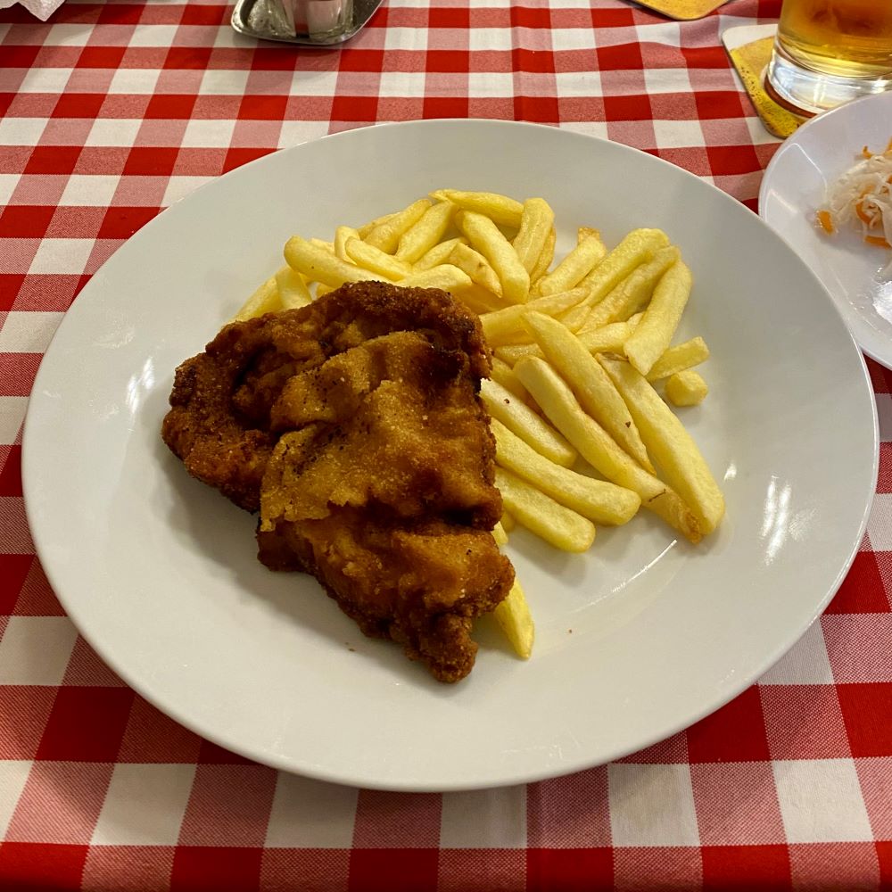 Dem Ausländer sollte nun das Tourist Menu für 3.000 HUF aufgeschwatzt werden. Alternativ könnte ich aber auch à la carte bestellen (ab 2.000 HUF für ein Hauptgericht). Doch in den modernen Zeiten, deren Zeuge wir sein dürfen, konnte ich mittels Applikation auf meinem Smartphone natürlich auch den Teil der Speisekarte übersetzen, der ausschließlich auf ungarisch vorlag. Das war nämlich der preiswerte Mittagstisch und jetzt bekam der gute Saša wie Imre & Co zunächst eine Hühnersuppe mit Nudeln vorgesetzt und anschließend folgte ein Schnitzel mit Pommes. Beides zusammen für 1.700 HUF (ca. 3,80 €). Es war essbar, aber definitiv kein Hochgenuss. Zum Glück hatte ich Dreher zum Nachspülen (ca. 1,90 € für 0,5 l). Doch was soll man für 3,80 € auch erwarten? Die Zeiten, wo man für den Preis in Budapest was Tolles serviert bekommen hat, sind sicher schon ein paar Jahre her.
