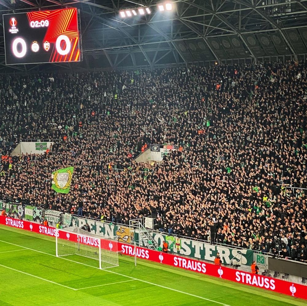 Eine bisher relativ chancenarmes Duell der Donaumetropolen ging mit der knappen Führung der Franzstädter in die Pause und der zweite Durchgang wurde von einer schönen Pyroshow der Green Monsters eingeläutet. Quantitativ war es gar nicht so wild, aber die grünen und roten Fackeln waren ganz gut im Sektor verteilt worden, so dass es ein nettes Gesamtbild wurde (siehe Titelbild). Wir Stadiontouristen hatten uns natürlich erhofft, dass der Gästeblock die zweiten 45 Minuten ebenso mit einer optischen Aktion einläutet, aber entweder haben die Crveno-beli (Rot-Weißen) ihre Utensilien dafür tatsächlich nicht ins Stadion bekommen oder es wurde bewusst darauf verzichtet.