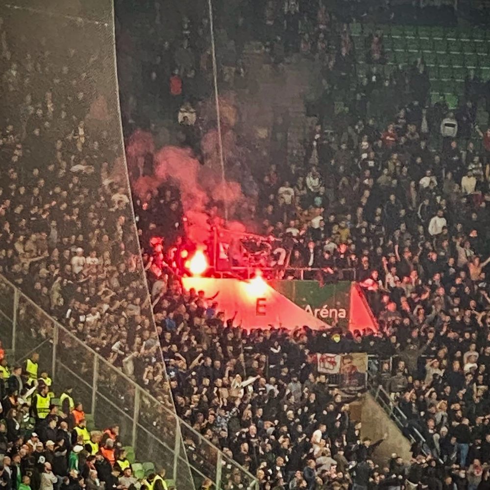 Dafür durften die Serben in der 55.Minute endlich jubeln. Bereits kurz nach Wiederanpfiff hatte der VAR den vermeintlichen Ausgleichstreffer von Pešić kassiert und einen ersten Freudenausbruch abrupt beendet. Doch knappe 10 Minuten später gab es am Torerfolg von Stefan Mitrović nichts zu beanstanden. Als kurz darauf Katai das 1:2 auf dem Fuß hatte, drohte das Spiel sogar zu kippen. Doch stattdessen sortierte sich Ferencváros wieder und Samy Mmaee erzielte in der 61.Minute nach einem Eckstoß per Kopf das 2:1 für die Mannschaft aus dem IX.Bezirk der ungarischen Hauptstadt. Abermals loderte es im Fanblock und siegesgewisse Grußbotschaften wurden in Richtung Gästekurve gesendet. Der sowohl serbische, als auch jugoslawische Rekordmeister versuchte anschließend viel. Doch ein erneuter Ausgleich sollte dem Team mit dem rotem Stern auf der Brust anscheinend nicht vergönnt sein.