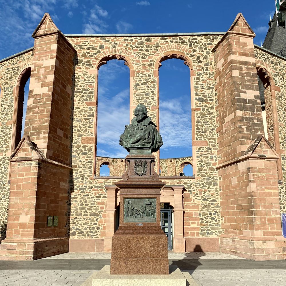 Vor dem Rathaus steht außerdem das 1896 enthüllte Brüder-Grimm-Nationaldenkmal. Diese beiden Märchenonkel sind nach Rudi Völler sicher die berühmtesten Söhne der Stadt. Man fragt sich natürlich beim Studium der Liste der Ehrenbürger Hanaus; wie kann ein so hübscher Mann wie Rudi Völler aus so einer hässlichen Stadt kommen? Und was ist dran an dem Gerücht, dass Netzer oder Delling damals auf Island gesagt haben, dass der Fußball der Nationalmannschaft unter Völler so attraktiv wie dessen Heimatstadt ist und der Teamchef deshalb bei Waldi im Studio komplett ausgerastet ist?