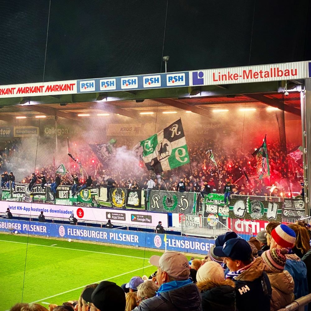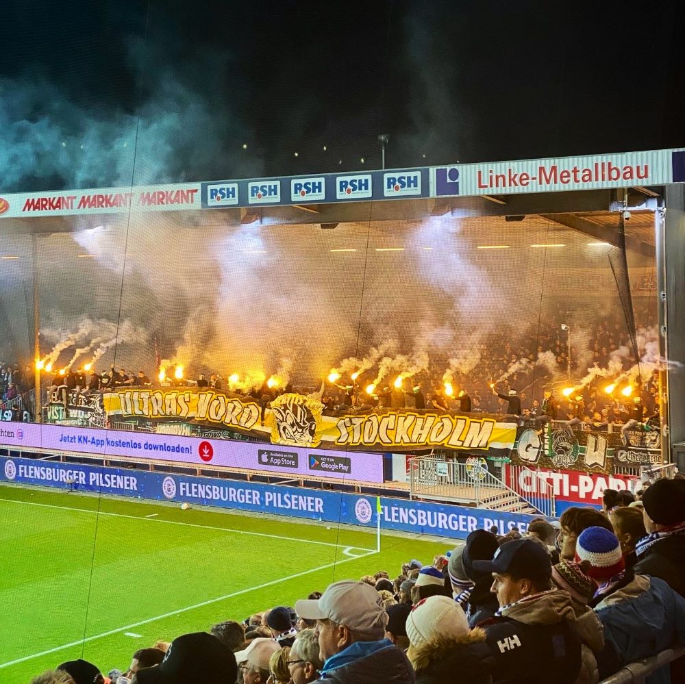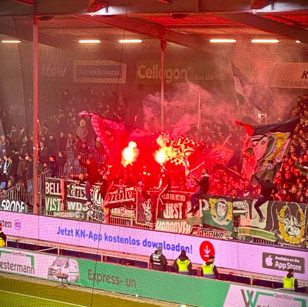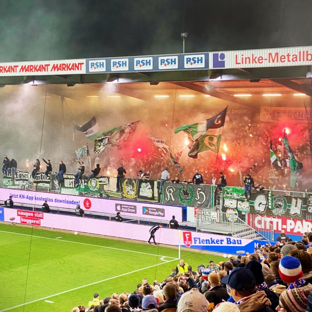 Aber die Kieler Szene besteht zur Zeit buchstäblich aus gebrannten Kindern. Die hatten am 9.September gegen den Hamburger SV ordentlich gefackelt und dem KSV damit eine Sportgerichtsstrafe in Höhe von 34.200 € eingehandelt. Der Verein rief seine „wahren“ Fans nun zum Denunzieren der Pyromanen auf und verbot der Szene u. a. den Infostand und das Verteilen ihrer Spieltagsflyer im Holstein-Stadion. Als Reaktion stellte die Szene vorerst alle Aktivitäten auswärts wie heim ein. Es folgten jedoch offenbar fruchtbare Dialoge zwischen den aktiven Fans und dem Präsidium, so dass man 29.Oktober wieder ins Stadion zurückkehrte. Allerdings ist es vorerst noch keine uneingeschränkte Rückkehr und auch heute hing lediglich das Banner der Dachgruppe Block 501 vor dem Fanblock, während alle anderen Gruppen noch auf ihren optischen Auftritt verzichten oder wie im Falle der Gruppe Campagno weiterhin ganz fernbleiben.