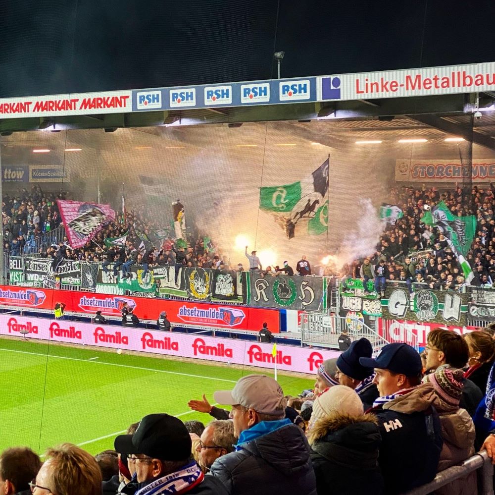 Nach dem Ausgleich durch Cedric Teuchert in der 16.Minute natürlich ein ganz anderes Bild. Die Schlachtenbummler aus Hannover zündeten abermals etliche Martinsfeuer und der Stadionsprecher erinnerte daran, dass jemand, der heute Namenstag feiern darf, demnächst auch wieder eine Zahlungsaufforderung der DFL im Postfach haben wird. Aber die Ultras sind eben der Meinung, dass dieser Verein es verdient hat pyrotechnisch begleitet zu werden. Es ist nunmal ihre Art der Fankultur und zum Glück ist Martin Kind jemand, der öffentlich darum wirbt andere Kulturen zu respektieren. So bat er jüngst in den Medien um Respekt gegenüber den viel gescholtenen Kataris: „Diese Länder haben eine ganz andere Geschichte und Kultur, das haben wir zu respektieren. Wir sind doch nicht die Herren der Welt! […] Sie haben es verdient, dass diese WM positiv begleitet wird.“