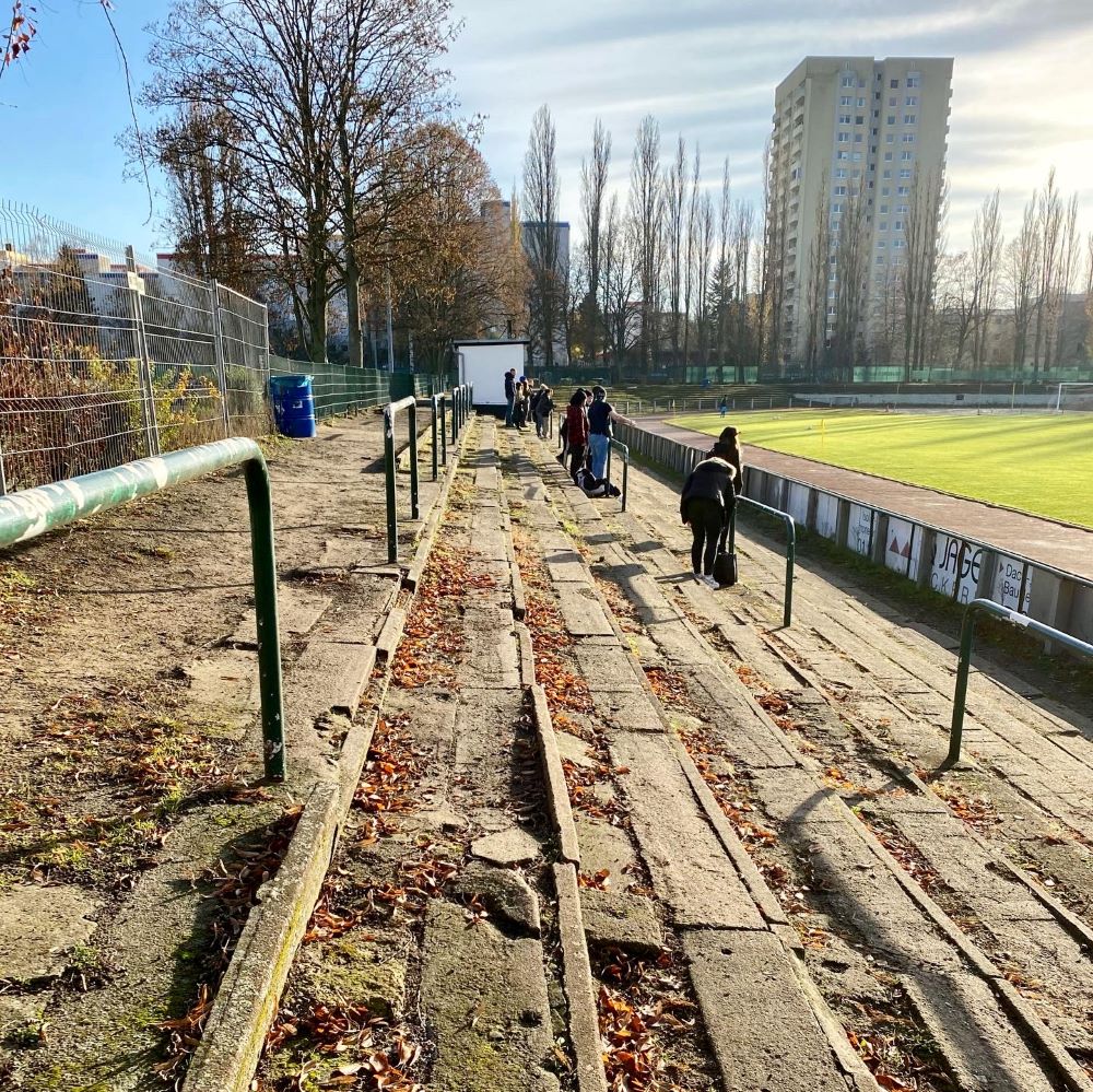 Da der ICE 374 gegen 13 Uhr Berlin (Südkreuz) erreichen sollte, waren Nachmittagsspiele in der Hauptstadt natürlich ebenfalls eine Option. Dort fiel mir die Ansetzung von Delay Sports ins Auge und ich beschloss bis Berlin weiterzufahren. Zwar nur Kreisliga C, aber Delay Sports kickt im schicken Preussenstadion, ist ein sehr schlagzeilenträchtiger Verein und passend zu meinem heutigen Reiseverlauf ist Delay der englische Begriff für Verspätung. Wobei es in diesem Fall eher Verzögerung meint und die Vereinsgründer nicht von irgendwelchen Ärgernissen mit der Deutschen Bahn inspiriert wurden. Es geht um stockenden Spielfluss beim Zocken der Videospielreihe FIFA von EA Sports, wenn beispielsweise die Server überlastet sind. Da die Vereinsgründer Elias Nerlich und Sidney Friede mit dem Streaming ihrer Videospielzockereien prominent geworden sind, fand ihre über den Vereinsnamen abstimmende Community diesen Namen am besten.