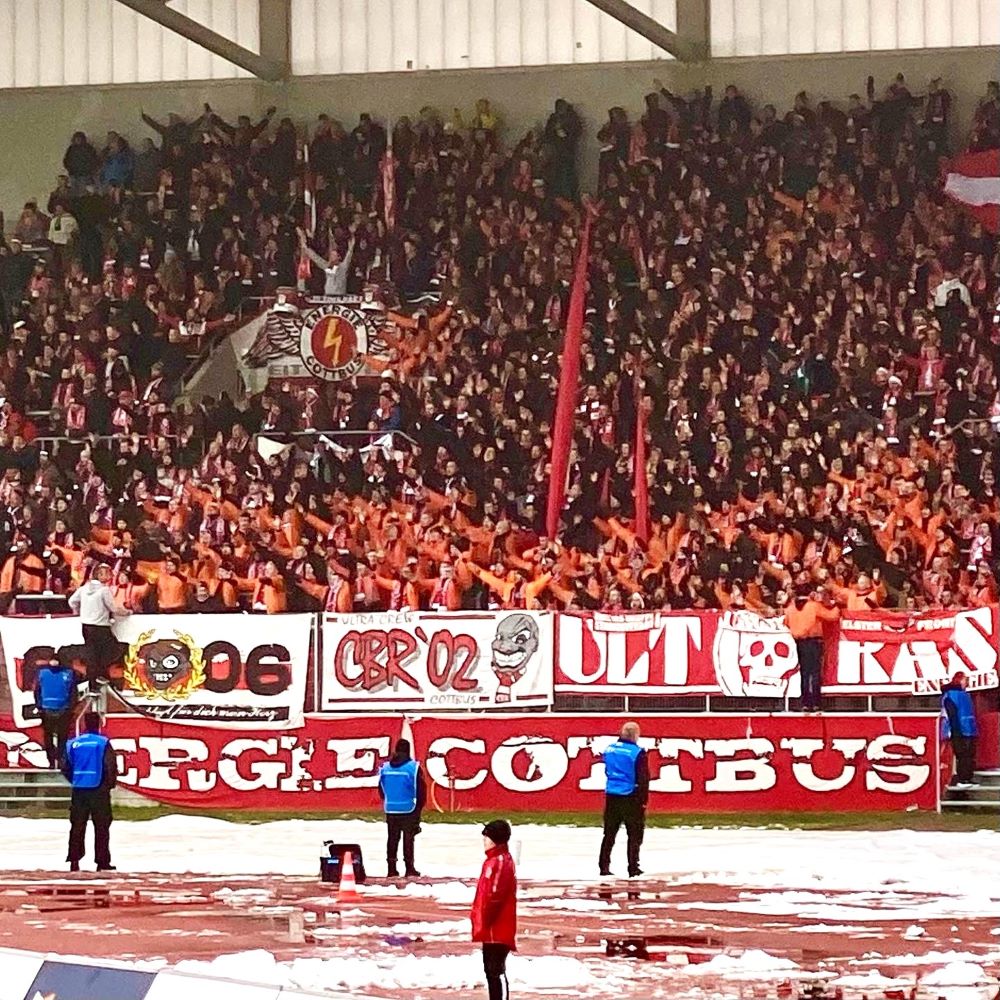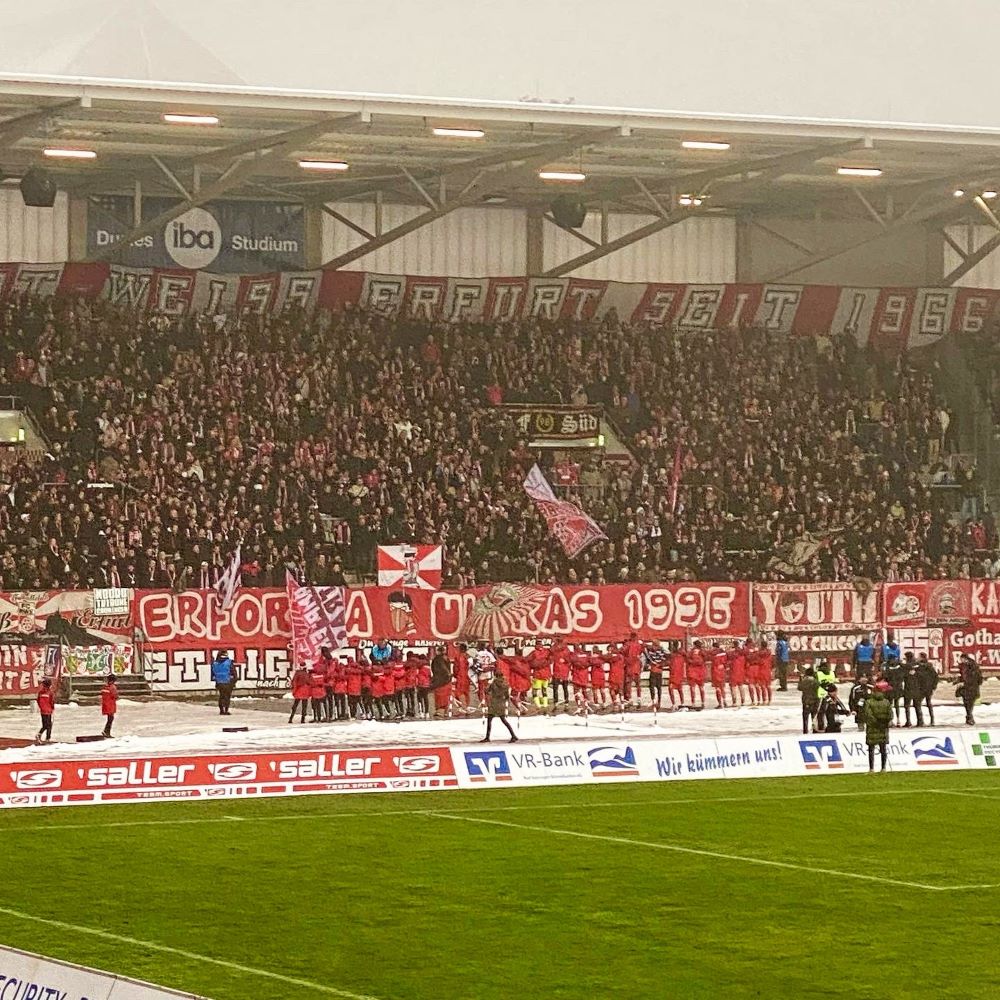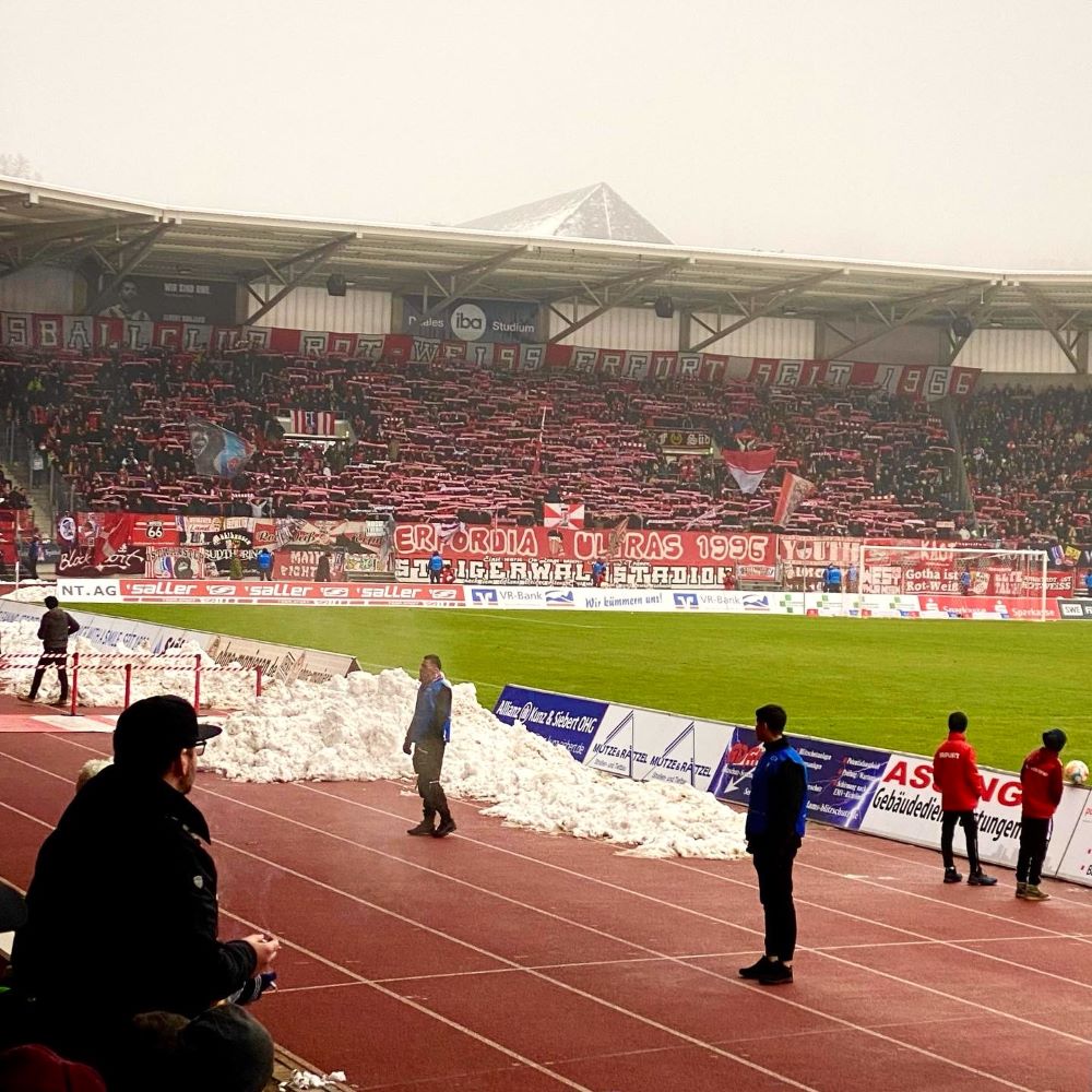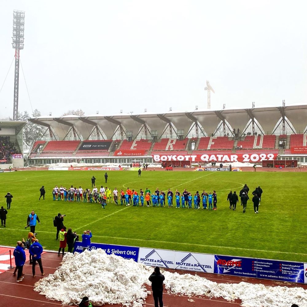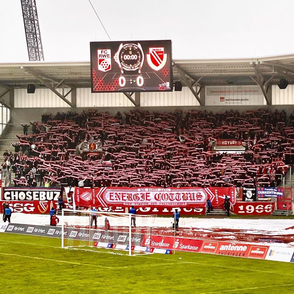Beim ersten Lacher des Abends kopierte ich noch instinktiv die Hand-vor-den-Mund-Geste unserer Nationalspieler, aber dann setzten sich Trotz und Lebensfreude durch. Denn wie sang Ricky Nelson 1962 so schön? Today’s teardrops are tomorrow’s rainbows and tomorrow’s rainbows I will share share with you… Meine Welt sollte so schnell wie möglich wieder bunter als eine One-Love-Binde werden und mein Goldtopf am Ende des Regenbogens hieß am 4.Dezember FC Rot-Weiß Erfurt vs. FC Energie Cottbus. Klar, nicht die Weltbühne des Fußballs, aber immerhin Erster gegen Zweiter in der viertklassigen Regionalliga Nordost. Warum nicht mal dem kleinen Fußball abseits von WM, EM, Champions League und Bundesliga eine Chance geben? Vielleicht ist das ja auch was für mich?