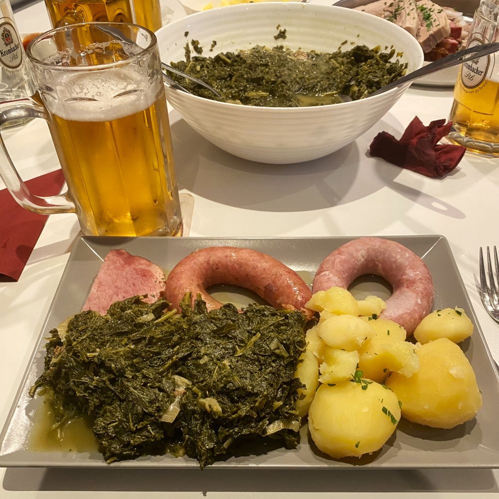 Zum Glück fingen mich meine Freunde auf. Am 3.Dezember ging es gemeinsam auf eine Kohlwanderung, um schnell wieder auf andere Gedanken zu kommen. Vom Hildesheimer Ostbahnhof marschierten wir via Galgenberg und Brockenblick nach Itzum, wo uns in Renates Schlemmerküche nach rund zweistündiger Wanderung (und halbstündiger Pause im Brockenblick) das norddeutsche Traditionsgericht serviert wurde. Bier und Aquavit rundeten die Sache ab und beim geselligen Beisammensein kam die Lebensfreude wieder zurück in mein Gesicht. Ein bisschen war ich allerdings im Zwiespalt. Darf man als echter Fan bereits zwei Tage nach dem Ausscheiden unserer Nationalmannschaft schon wieder Spaß haben?
