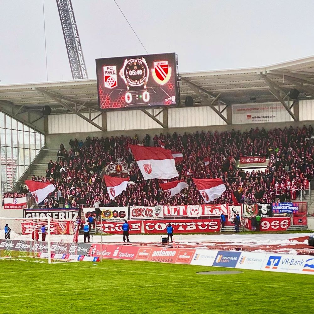 In jedem Fall war es wie eingangs erwähnt ein echtes Topspiel. Der von Ex-96er Fabian Gerber trainierte FC RWE – übrigens 7.Platz in der Ewigen Tabelle der DDR-Oberliga – hatte sich als Aufsteiger die Tabellenführung erobert. Während Energie Cottbus – nebenbei 24.Platz in der vorgenannten Ewigen Tabelle – nach 14 Spieltagen auf dem 2.Tabellenplatz lauerte. Mit einem Auswärtssieg am Fuße des Steigerwalds würde man vorerst an den Erfurtern vorbeiziehen können. Entsprechend hatte die Fanszene des FC Energie in den letzten Tagen mächtig für dieses Spiel getrommelt. Das Ziel war mit 1.000+x Gästefans in Erfurt aufzutauchen. Es ist den Lausitzern gelungen, wenngleich x wahrscheinlich nur durch eine sehr niedrige Zahl ersetzt werden kann. Aber über 1.000 Fans im Gästeblock (und knapp 7.500 Zuschauer insgesamt) war schon top, da kann man nicht meckern.