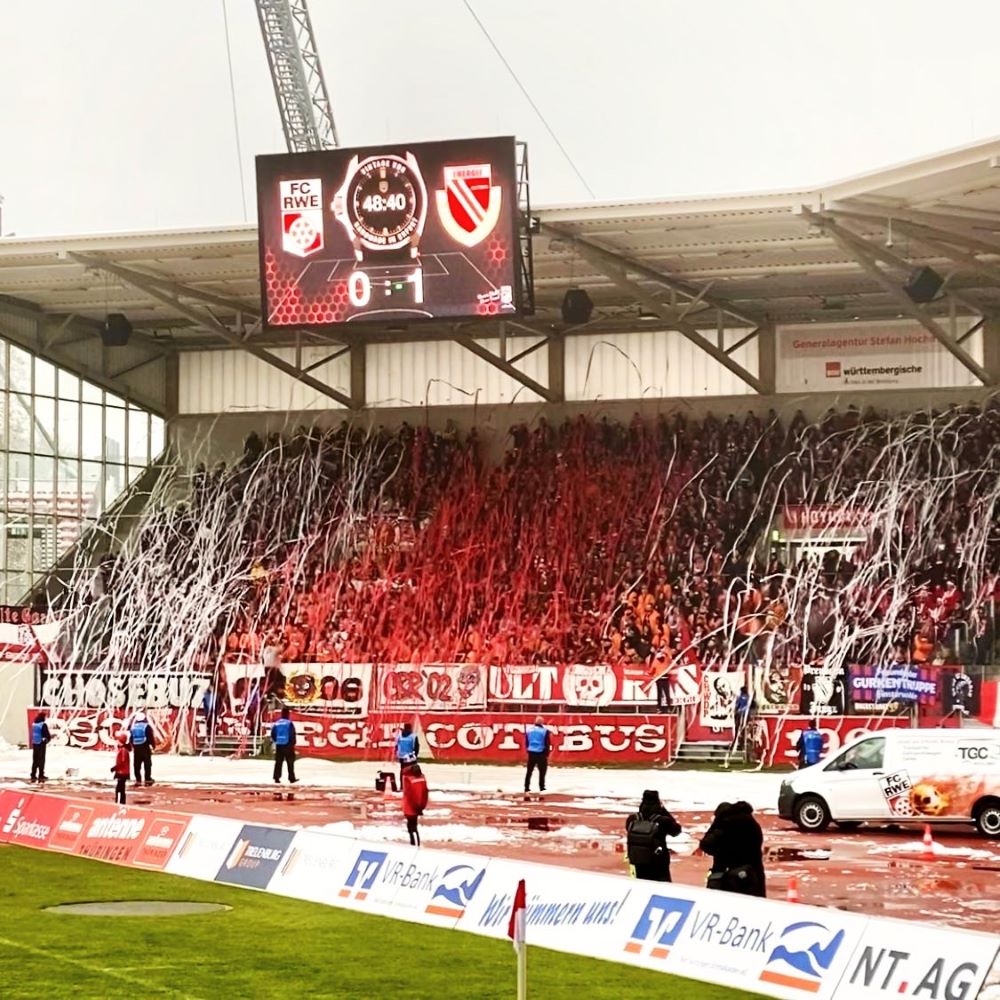 Es ging also pyrofrei mit 0:1 in die Pause und nachdem die Spieler die Seiten gewechselt hatten, lief es vorerst weiter wie gehabt. Erfurt versuchte Druck aufzubauen, aber der ehemalige Bundesligist ließ kaum gute Torgelegenheiten zu und lauerte zugleich auf Konter. Für den ersten Höhepunkt des zweiten Durchgangs sorgten daher wieder die FCE-Fans. Sie hatten die viertelstündige Unterbrechung genutzt, um überall im Block Wurfrollen in rot und weiß zu verteilen. In der 49.Minute gingen diese schließlich auf Kommando als Schleier auf der Tartanbahn nieder. Danach blieben die über 1.000 Mitgereisten weiterhin sangesfreudig und durften in der 67.Minute ein weiteres Tor ihrer Lieblingsmannschaft bejubeln. Denn das Team verfügt über etwas, was im Cottbusser Fanblock wahrscheinlich weiterhin Mangelware ist: Einen sichtbaren und sehr aktiven Linksaußen. Nicolas William Wähling heißt dieser und konnte in besagter Spielminute auf 0:2 erhöhen.
