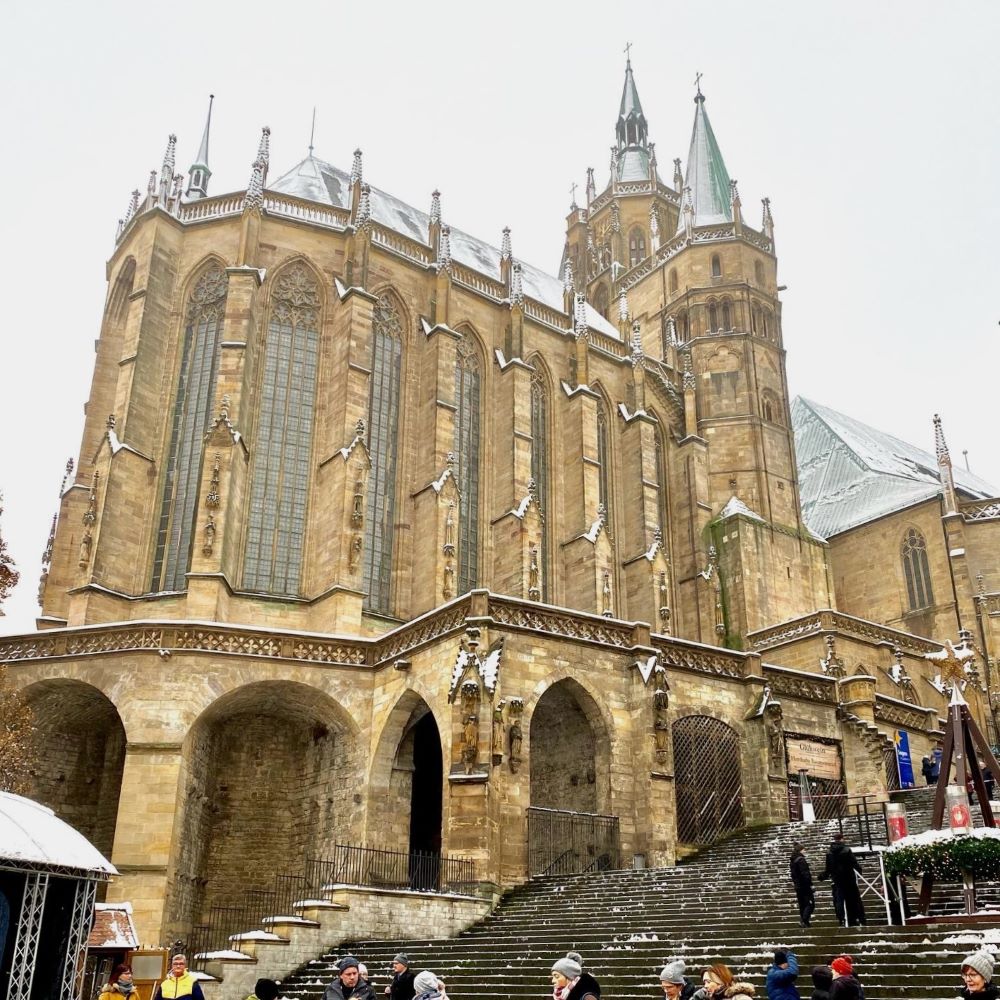 9:46 Uhr erreichte ich meinen Zielort und hatte nun drei Stunden für klassische touristische Motive. Die bereits mehrfach von mir besuchte Hauptstadt Thüringens (ca. 215.000 Einwohner) hat diesbezüglich einiges zu bieten. Schließlich wurde Erfurt schon im Jahre 742 das erste Mal urkundlich erwähnt. Bonifatius, der Apostel der Deutschen, hatte am Ort der germanischen befestigten Siedlung Erphesfurt (einer Furt des Flusses Gera) einen Bischofssitz eingerichtet, den er sich in jenem Jahr vom Papst Zacharias bestätigen lassen wollte. Kurz darauf muss auch der Grundstein für den Erfurter Dom gelegt worden sein. Allerdings bestand das Bistum Erfurt nur wenige Jahre. Bereits 747 wurde es dem mächtigen Bistum Mainz untergeordnet.