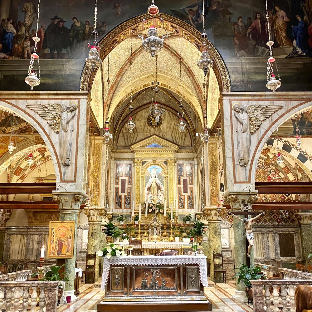 Anschließend wurde das prächtige Innere der barocken Wallfahrtskirche bewundert. Als die Pest in den 1420er Jahren heftig im Veneto wütete, soll die Jungfrau Maria hier zweimal einem Mädchen namens Vicenza Pasini erschienen sein. Maria meinte zu Vicenza, dass die Seuche endet, wenn die Bewohner der Stadt auf diesem Hügel eine neue Kirche bauen. Also fix ’ne kleine Kapelle auf dem Monte Berico errichtet, viel gebetet und die Epidemie endete wenig später tatsächlich. Weil die Menschen früher wahrscheinlich noch schlechter zwischen Korrelation und Kausalität unterscheiden konnten, glaubten alle an ein Wunder und die Kirche wurde prächtig ausgebaut und nebendran noch errichtete man außerdem ein Kloster.
