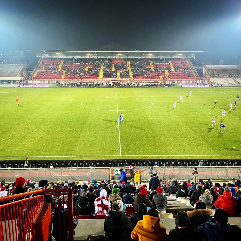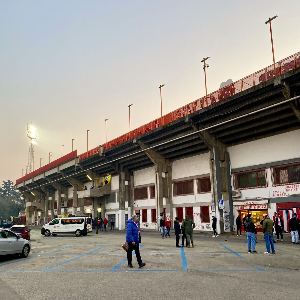 Vom Teatro Olimpico war es dann gar nicht mehr weit zum hiesigen und ca. 13.000 Zuschauer fassenden Fußballstadion (1935 eröffnet). Gegen 17:45 Uhr passierte ich ein Drehkreuz des Stadio Romeo Menti und kurioserweise hätte mich die Reise heute beinahe in ein rund 750 km von Vicenza entferntes Stadion gleichen Namens geführt. Denn auch in Castellammare di Stabia steht ein Stadio Romeo Menti und in meiner Ursprungsplanung wollte ich die Wochenmitte eigentlich in Napoli (Neapel) und Umgebung verbringen. Zwar hatte Napoli überraschend das Achtelfinale der Coppa Italia gegen US Cremonese vergeigt und somit war heute kein von mir ersehntes Pokalviertelfinale im Stadio Diego Armando Maradona angesetzt. Doch weil Juve Stabia heute wie Vicenza ein Heimspiel in der Serie C hatte und Castellammare di Stabia sich im Speckgürtel Napolis befindet, überlegte ich dennoch am Abstecher gen Napoli festzuhalten. Am Ende siegte allerdings die Bequemlichkeit und ich blieb im Norden des Landes.