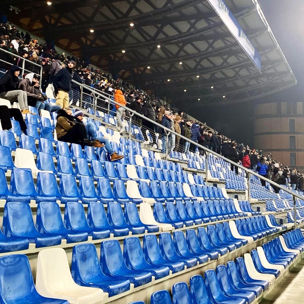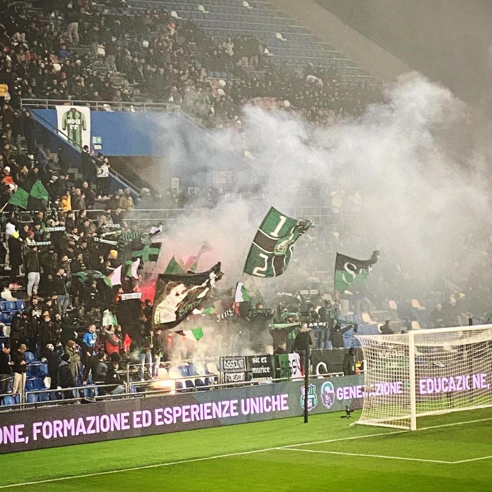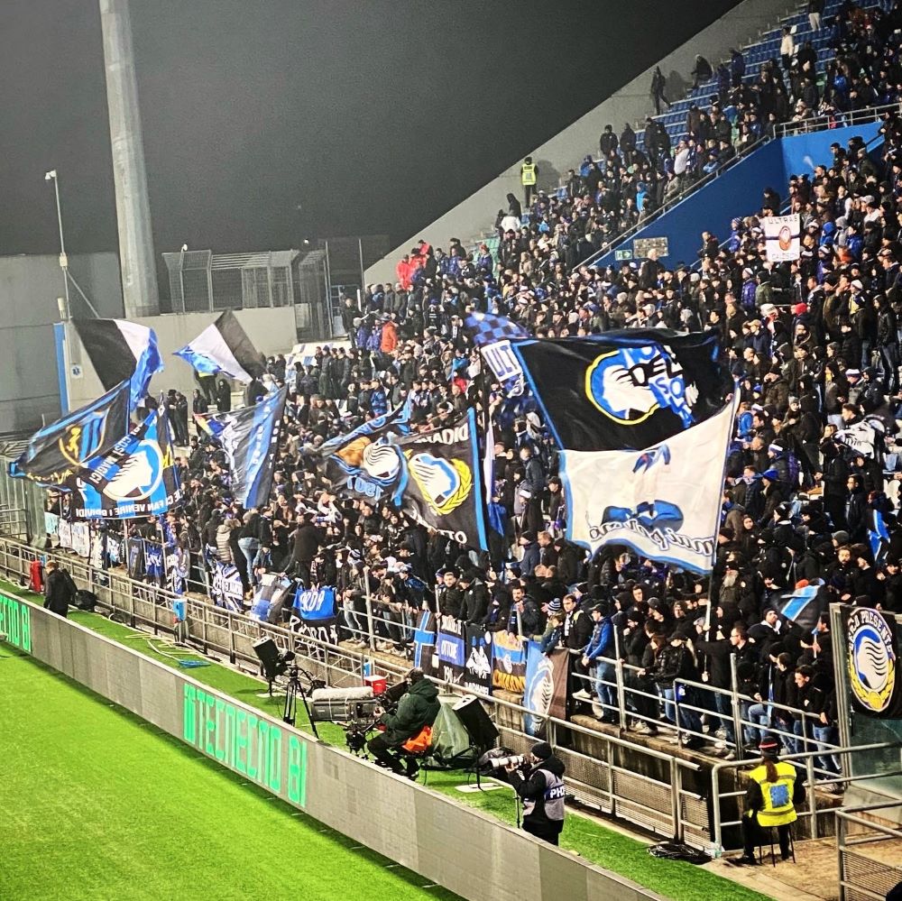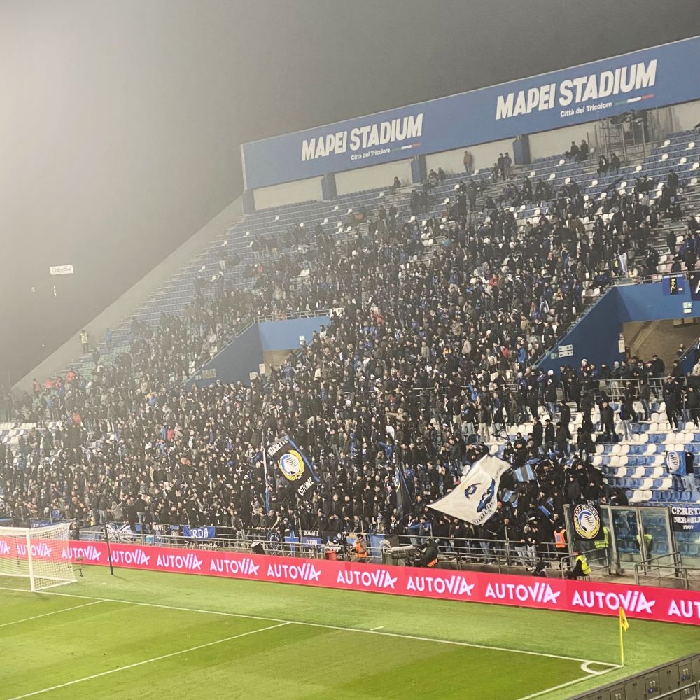 Atalantas Anhang profitierte heute nicht nur von seiner Ortskenntnis. Auch gab es keine behördlichen Auflagen in Sachen Ticketverkauf oder Anreise, so dass die Szene – anders als am Dienstag in San Siro (Vgl. Milano 01/2023) – lautstark und mit wehenden Fahnen im Gästesektor präsent war. Gegen die konnte der wesentliche kleinere Stimmungskern aus dem lediglich 30 km entfernten Sassuolo nicht wirklich anstinken. Aber sie waren bemüht und ein bißchen gezündelt haben sie auch. Dazu kam ihnen der Spielverlauf entgegen. Zwar war Atalanta der klare Favorit, aber Joakim Maehle lassierte in der 30.Minute nach Foulspiel einen Platzverweis. Übrigens wollte der Schiedsrichter es bei einer Verwarnung belassen, aber der VAR hatte mehr gesehen und griff ein.