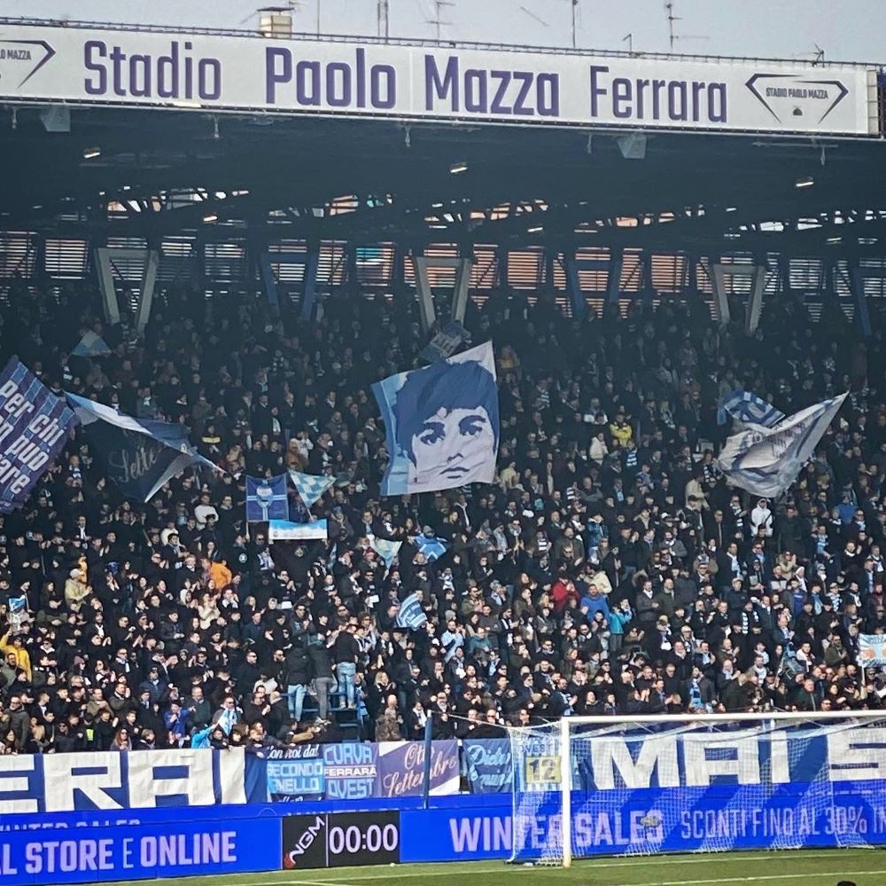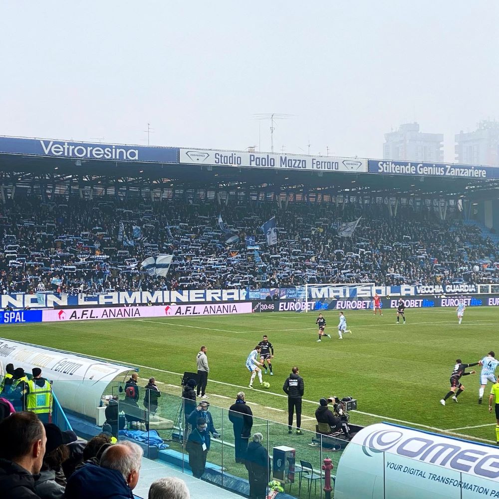 Heute durfte diese respektierte Kurve ein Spiel ihrer Biancazzurri erleben, was irgendwie sehr gut zur turbulenten jüngeren Vereinsgeschichte passte. Tore von Folorunsho (20.Minute) und Esposito (26.) hatten den Baresi die Halbzeitführung beschert. SPAL kam jedoch energisch aus der Pause und in dieser Drangphase lag ein Treffer der Gastgeber mehrfach in der Luft. Als in der 55.Minute allerdings das 0:3 durch Cheddira fiel, schien alles vorentschieden. Der Anschlusstreffer von Moncini (62.) entfachte auch nur kurz Hoffnung, da Antenucci fünf Minuten später das vierte Tor für Bari besorgte. Doch ein Doppelschlag durch den prominenten Neuzugang Radja Nainggolan (81.) und Raffaele Celia (83.) drohte in der Schlussphase nochmal alles auf den Kopf zu stellen.