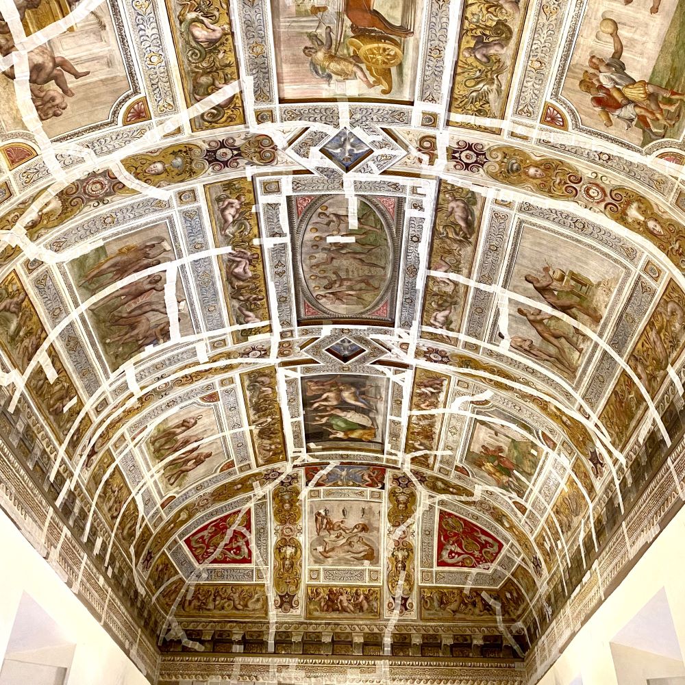 Für einen zweiten Museumsbesuch fehlte mir leider die Zeit, aber auch im Castello Estense gab es zuvor schon jede Menge Kunst für mich zu sehen. Im Rahmen der ständig wechselnden Ausstellungen war mir beispielsweise ein Einblick ins Œuvre des zeitgenössischen Künstlers Carlo Guarienti erlaubt. Gekommen war ich allerdings ehrlicherweise für die Meisterwerke der Renaissance, insbesondere die prächtigen Deckenmalereien im Schloss. Zwar nahmen sie bei einem Erdbeben im Jahr 2012 erheblichen Schaden und die Restauration dauert noch an (viele Risse sind gegenwärtig abgeklebt), aber die Kunstfertigkeit ihrer Schöpfer kommt dennoch ausreichend zur Geltung.