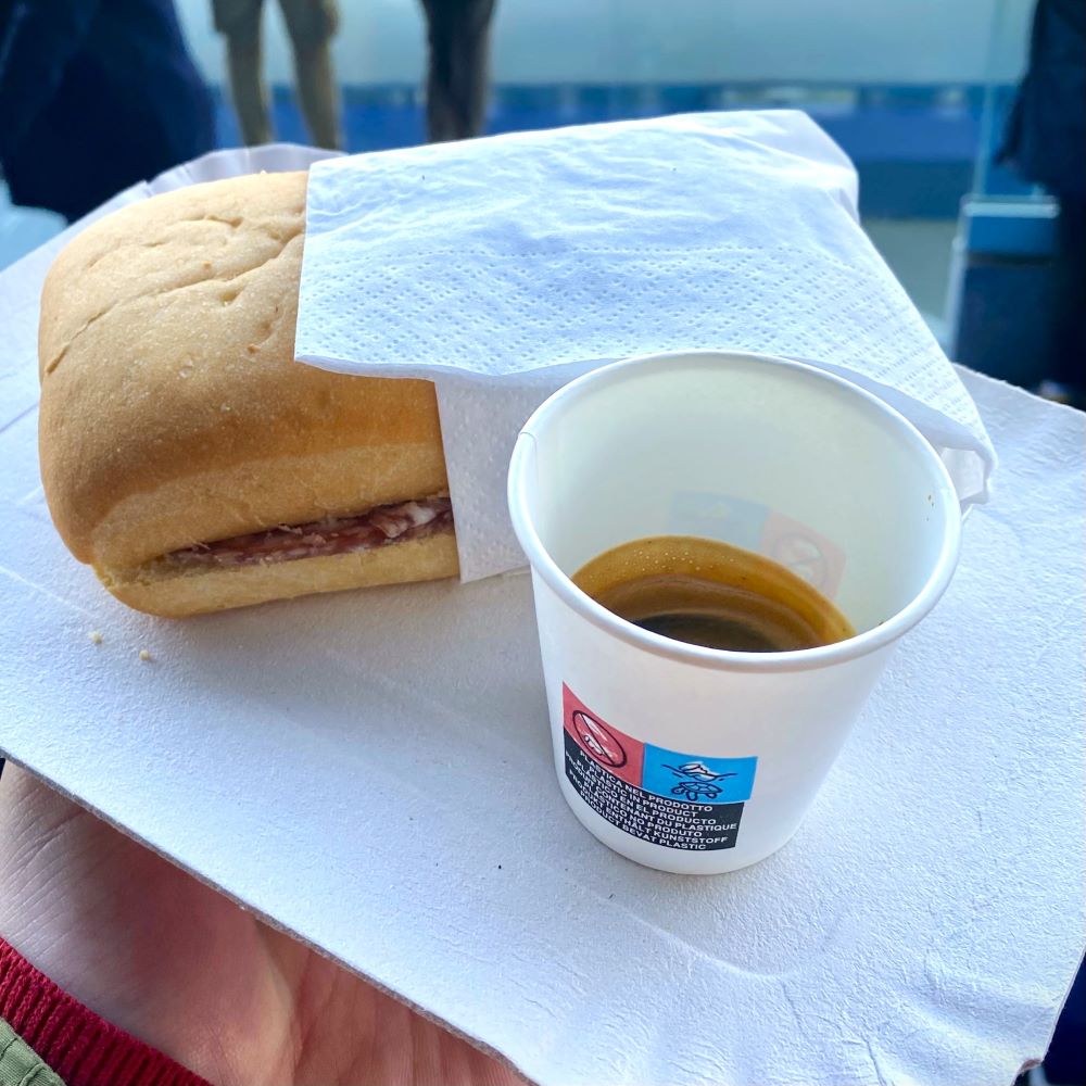 Auf dem Weg zum Abendspiel hatte ich nun außerdem knapp 40 Minuten Aufenthalt in Bologna. Da am dortigen Hauptbahnhof die italienische Pastakette Dispensa Emilia mit den üblichen Fast-Food-Verdächtigen um hungrige Reisende rang, gönnte ich mir meinen abendlichen Primo einfach schon mal auf der Durchreise. Ich bestellte Strozzapreti con crema di parmigiano, pancetta e pepe (9,90 €) und ließ die Pasta von einem Glas Rotwein begleiten (2,50 €). Durch den systemgastronomischen Ansatz stand der Teller schnell auf dem Tisch und die käsigen Nudeln mit Speck und Pfeffer waren auch echt gut.