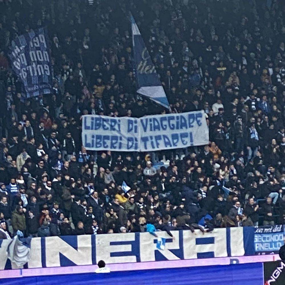 Da Bari natürlich auch Fans außerhalb Apuliens hat (allein schon aufgrund der Arbeitsmigration von Süd nach Nord in Italien), waren dennoch ein paar hundert Anhänger der Biancorossi im Gästeblock. Auf Beflaggung wurde allerdings verzichtet und einen organisierten Tifo gab es ohne den harten Kern aus Bari ebenfalls nicht. Die Heimkurve reagierte mit einer auf Tapete gepinselten Forderung nach Reisefreiheit für Fußballfans und erntete dafür auch von mir Applaus. Die Repression zur vermeintlichen Gewaltprävention nimmt in Bella Italia wirklich gerade wieder zu und wenn es ganz blöd läuft, sehen die Kurven bald erneut so trist wie nach der Einführung der Tessera del tifoso aus.
