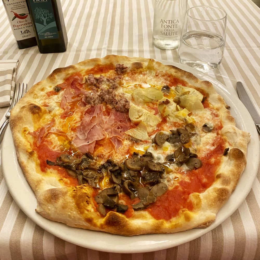 Um 18:15 Uhr erreichte ich schließlich Reggio Emilia und den Umweg durch’s Stadtzentrum sparte ich mir nach Einbruch der Dunkelheit. Das Zeitfenster bis zum Anpfiff war nicht besonders üppig und das Fußballstadion der Città del Tricolore liegt nicht so schön zentral wie in Modena oder Ferrara. Wenigstens war mit der Trattoria del Buontempone ein gutes Restaurant am Wegesrand, welches um 19 Uhr seine Pforten öffnete. Zwar waren alle Tische reserviert, aber für höchstens 45 Minuten wäre noch was möglich. Ich konnte dem Oberkellner die Verlegenheit nehmen, denn das passte mir prima und ich wollte sowieso nur eine Pizza essen. Für eine leckere Pizza alle quattro stagioni, eine Flasche Wasser und Coperto wurden am Ende 14,50 € verlangt.