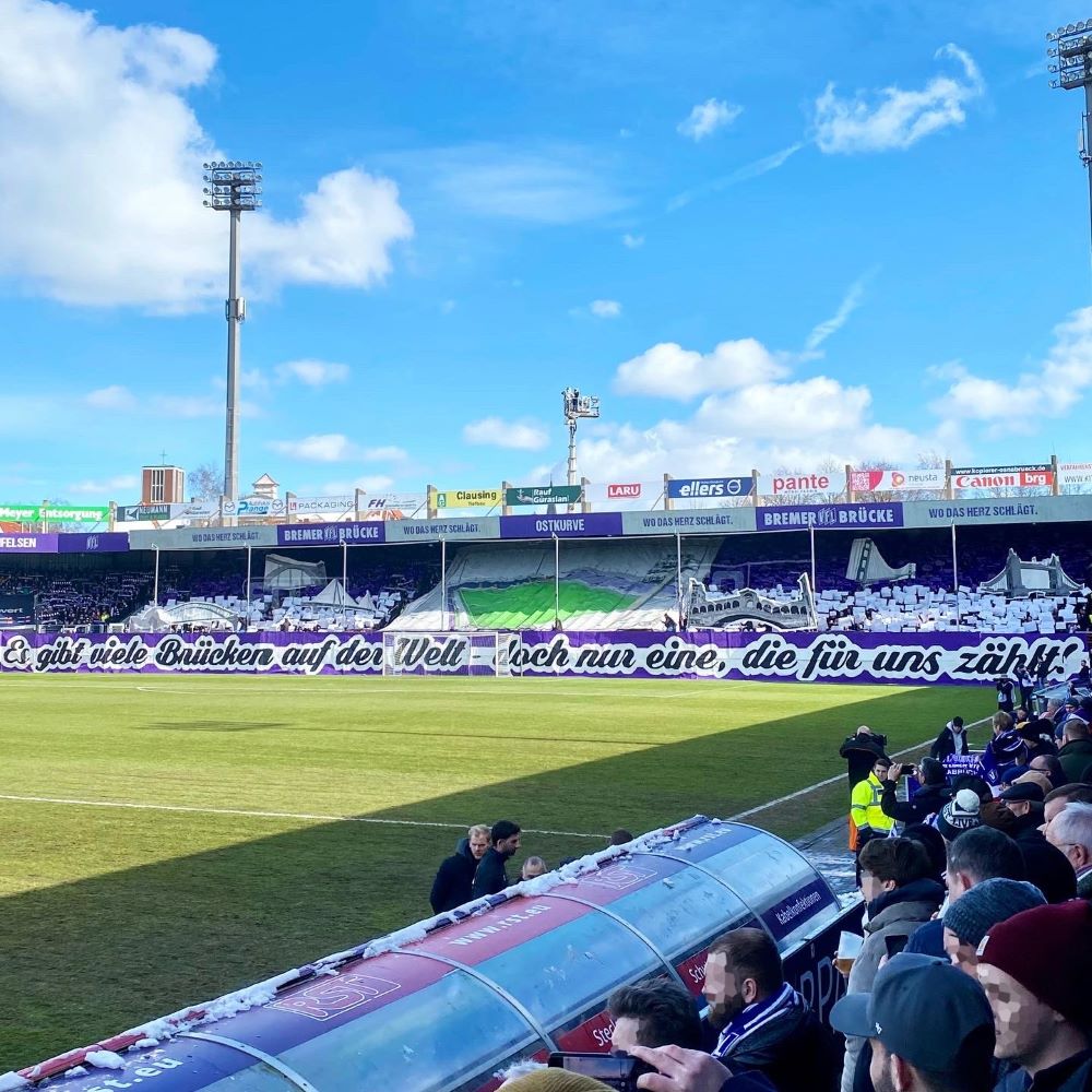 Mal abgesehen davon, dass Niedersachsen oder so etwas wie eine niedersächsische Identität prinzipiell nur Konstrukte der jüngeren Vergangenheit sind, fühlen sich die Westfalen aus Osnabrück bei den Ostfalen, Engern und Friesen des restlichen Niedersachsens mittlerweile glaube ich ganz gut aufgehoben. Dass man das heutige Duell mit dem VfB Oldenburg – der übrigens erstmals seit 1999 wieder an der Bremer Brücke gastierte – als Niedersachsenderby vermarkten kann, ist dabei ein netter Nebeneffekt. Neben der gegenwärtigen Erfolgsserie des VfL Osnabrück, dürfte der Derbycharakter seinen Anteil am erstmals seit November 2019 ausverkauften Osnabrücker Stadion gehabt haben.