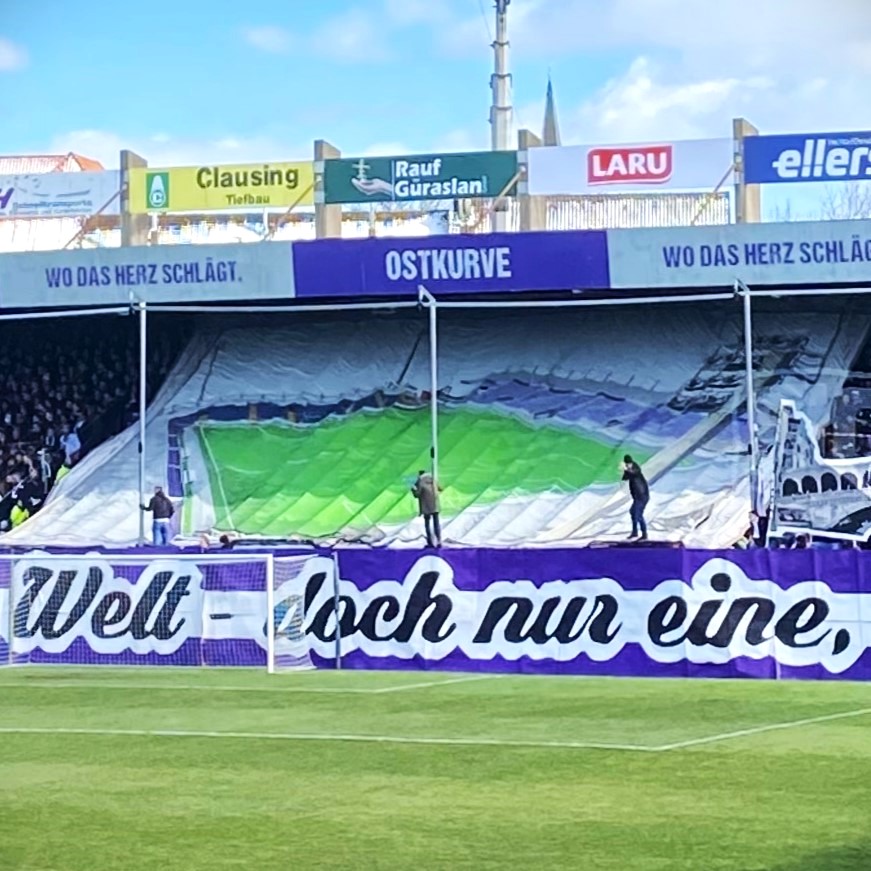 Die Osnabrücker hatten im Prinzip die gleiche Aufgabe für ihren Heimsektor, setzten sie allerdings etwas aufwändiger um. Auf eine große Blockfahne im Zentrum ihrer Tribüne hatten sie ihr Stadion an der Bremer Brücke gemalt. Links und rechts davon wurden nun nicht nur Papptafeln in den Vereinsfarben in die Höhe gereckt, sondern auch auf Textil gepinselte und in ihren Umrissen ausgeschnittene berühmte Brücken aus aller Welt. Den Spruch auf der riesigen Banderole vor der Ostkurve konnte ich nun ganz ohne Insiderwissen bereits vor dem Ausrollen vorwegnehmen: „Es gibt viele Brücken auf der Welt – doch nur eine, die für uns zählt!“ Für die Gesamtleistung gibt es von mir 11 Punkte im fankulturellen Studienseminar.