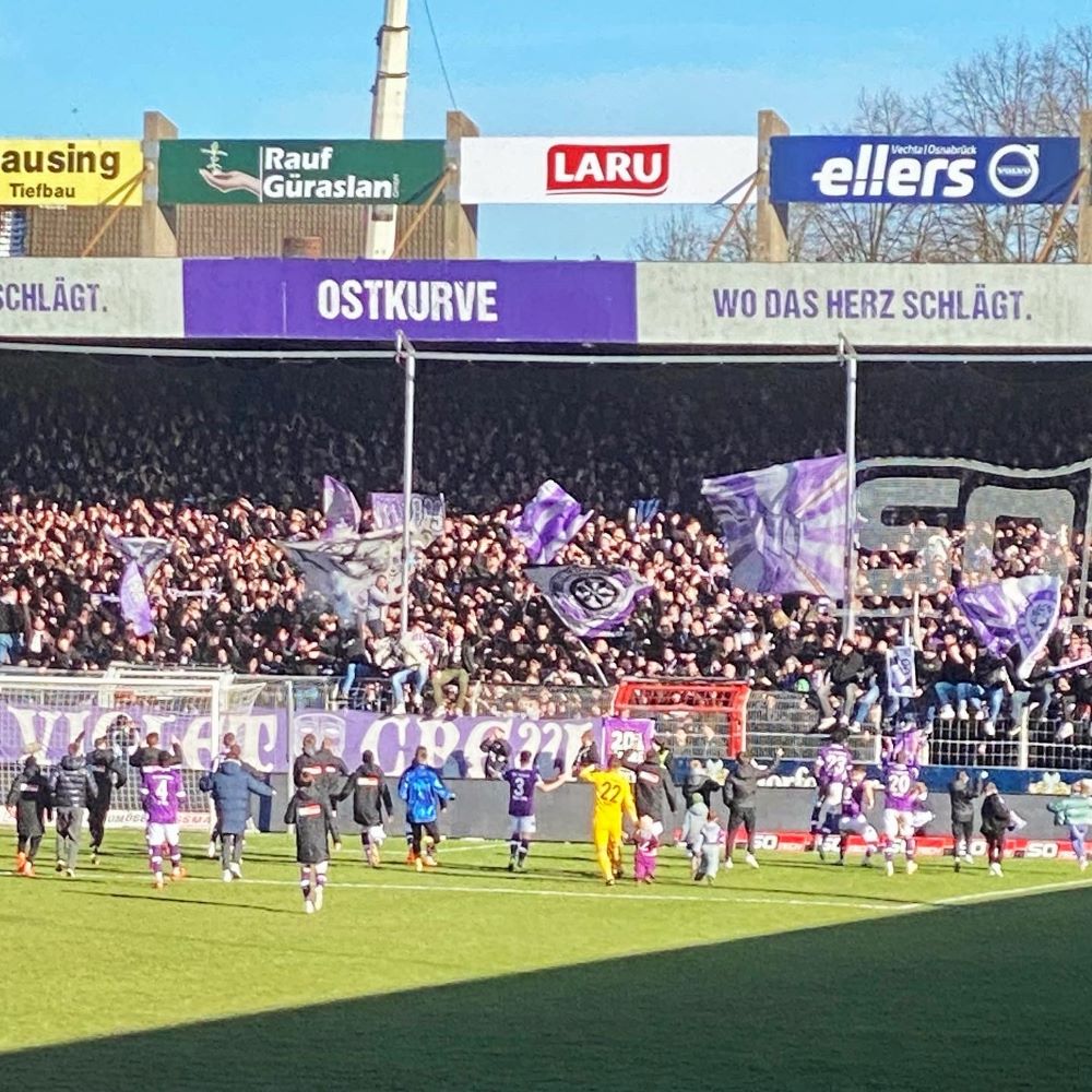 Der Verein für Leibesübungen von 1899 bleibt mit dem heutigen Heimsieg ein heißer Aufstiegskandidat und wurde nach Abpfiff entsprechend euphorisch vom Publikum gefeiert. Nach durchwachsenem Saisonstart (das Hinspiel hatte beispielsweise der VfB Oldenburg mit 4:3 für sich entscheiden können), markierte anscheinend der Sieg im anderen Niedersachsenderby gegen den SV Meppen den Wendepunkt für die Osnabrücker (siehe Meppen 11/2022). Zuvor hatte man aus 16 Spielen lediglich mäßige 19 Punkte geholt (1,1875 Punkte im Schnitt), doch zum Triumph in Meppen sollten sich acht weitere Siege in den kommenden neun Spielen gesellen (Punkteschnitt: 2,7). Da der gegenwärtige Tabellenzweite Freiburg II nicht aufstiegsberechtigt ist und der aktuell drittplatzierte SVWW nur einen Punkt mehr als der VfL auf dem Konto hat, dürfen die Osnabrücker sich durchaus Chancen auf einen direkten Aufstiegsplatz ausrechnen.