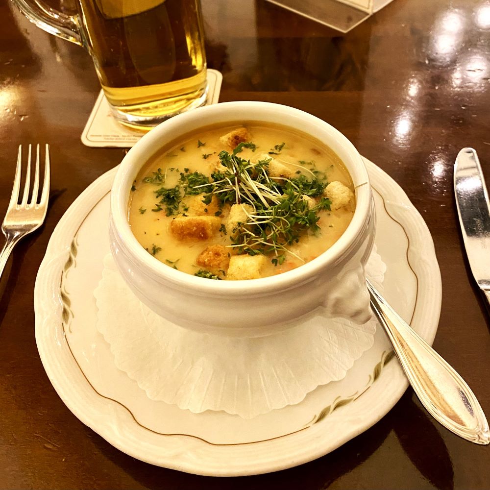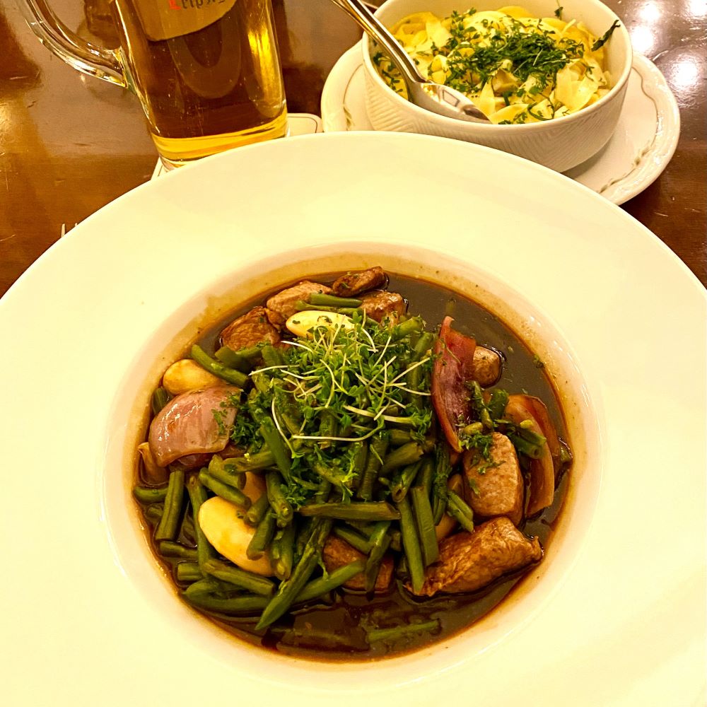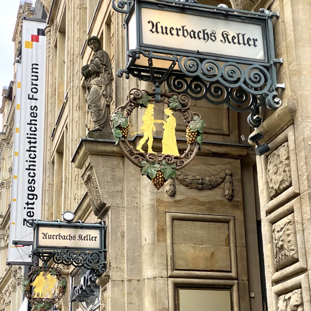 Nach dem Besuch des Zeitgeschichtlichen Forums ging es auf 13 Uhr zu. Nun musste ein Mittagessen her und praktischerweise befindet sich gleich nebenan die Mädlerpassage mit dem Traditionsrestaurant Auerbachs Keller. Hier blickt man auf über 500 Jahre Gastlichkeit zurück und kam durch eine Szene in Goethes Faust zu Weltruhm. Entsprechend sind die vielen Nischen im bis zu 600 Gäste fassenden Gewölbekeller mit Wandmotiven aus Faust I und Faust II ausgestaltet. In diesem reizvollen Ambiente ließ ich mir zunächst eine Kartoffelsuppe mit gedünstetem Wurzelgemüse, Speck, Zwiebeln und Croûtons servieren. Anschließend kamen als Hauptgang glacierte Filetwürfel vom Lammrücken mit zweierlei Bohnen und roten Zwiebeln in Portweinsauce an meinen Tisch. Als Begleitung dazu wählte ich außerdem gekräuterte Bandnudeln.