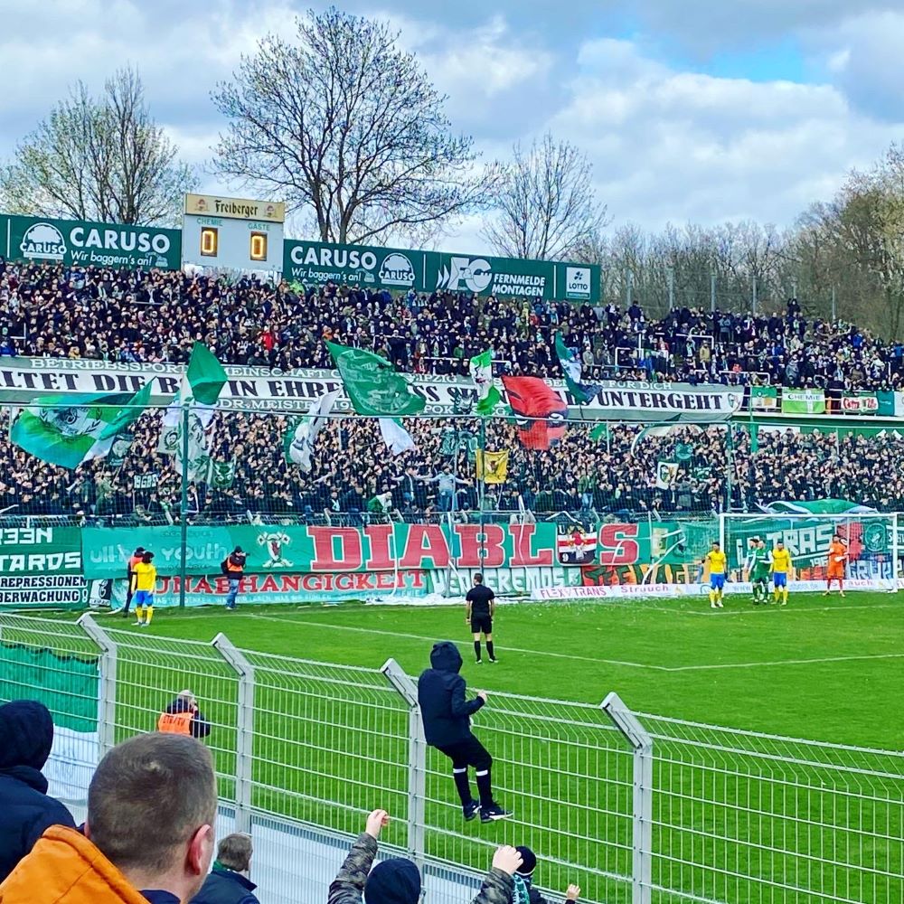 Lok ist supporttechnisch bekanntlich eher aus einem anderen Holz geschnitzt. Was so ein Derby grundsätzlich interessanter gestaltet, als wenn beide Rivalen sich mehr gleichen, als ihnen eigentlich lieb sein dürfte. Der Auftritt von Lok (und ihren Freunden aus Halle) war auch gar nicht übel, aber zu ihrem Stil gehört neben dem eher rustikalen Liedgut und ordentlich Zaunrütteln eigentlich auch eine fetzige Pyroshow. Die ließ man heute vermissen und hatte damit offenbar das Flehen des Vereins erhört. In der vergangenen und der aktuellen Saison hatten Aktionen der Fans dem 1.FC Lokomotive bereits über 40.000 € an Verbandsstrafen eingebrockt. In dem finanziellen Rahmen, in jenem sich der Nachfolgeverein des ersten deutschen Fußballmeisters VfB Leipzig gegenwärtig bewegen muss, ist das viel Geld, was im Etat spürbar woanders fehlt.