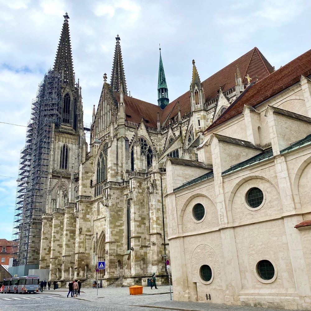 Anschließend war mir die bereits erwähnte Porta Praetoria einen kleinen Abstecher wert, ehe es weiter zum Regensburger Dom ging. Es ist nicht nur die einzige gotische Kathedrale Bayerns, sondern neben dem Kölner Dom wahrscheinlich auch die bedeutendste Kathedrale dieser Stilepoche in ganz Deutschland. Mit dem Kölner Pendant teilt man sich obendrein eine ähnliche Baugeschichte. Nachdem die Regensburger Dombauhütte 1275 ihre Arbeit aufnahm, sollte die Vollendung noch viele Jahrhunderte auf sich warten lassen. Im 15.Jahrhundert war der Regensburger Dom zwar weitgehend fertiggestellt und liturgisch nutzbar, doch in den 1520er Jahren wurden die Arbeiten vorläufig eingestellt. Erst 1859 gab der bayrische König Ludwig I. den Auftrag zum Weiterbau der unvollendeten Westfassade mit den zwei je 105 m hohen Türmen und 10 Jahre später waren diese Arbeiten abgeschlossen.
