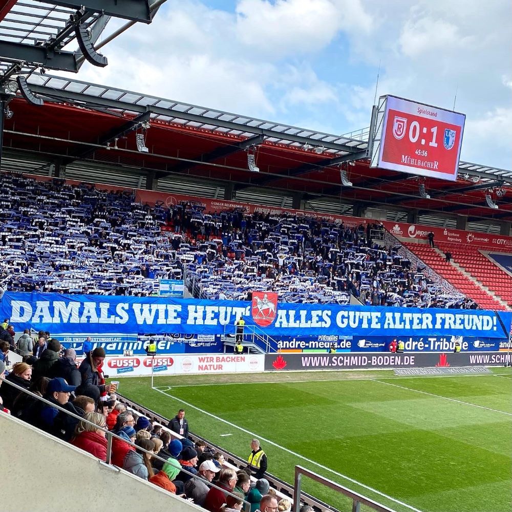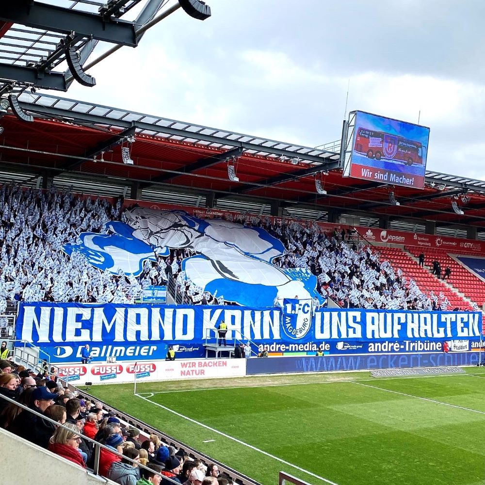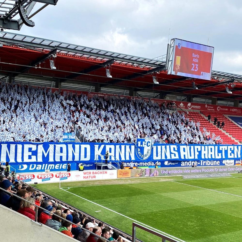 Mit einem Auswärtssieg bei wesentlich akuter abstiegsgefährdeten Regensburgern (aktuell 16.Platz) könnte man weitere Big Points für den Klassenerhalt eintüten und entsprechend motiviert starteten die Blau-Weißen in die Partie. Kaum war die Choreo der Magdeburger Fans vollendet, belohnte Atik den mutig nach vorne spielenden 1.FCM mit einem Freistoßtor (11.Minute). Das sorgte natürlich für einen leidenschaftlichen Torjubel im Gästesektor und die selbsternannten „Größten der Welt“ sollten bis zur Pause weiterhin eine dominante Clubelf erleben. Während der SSV Jahn von 1889 komplett ohne ernsthafte Torchance im ersten Durchgang blieb, kamen die Magdeburger noch zu einigen weiteren Abschlüssen. War fast schon schmeichelhaft, dass es nur mit 0:1 in die Pause ging.