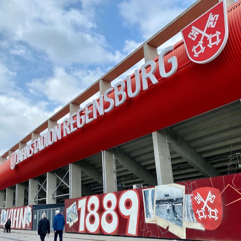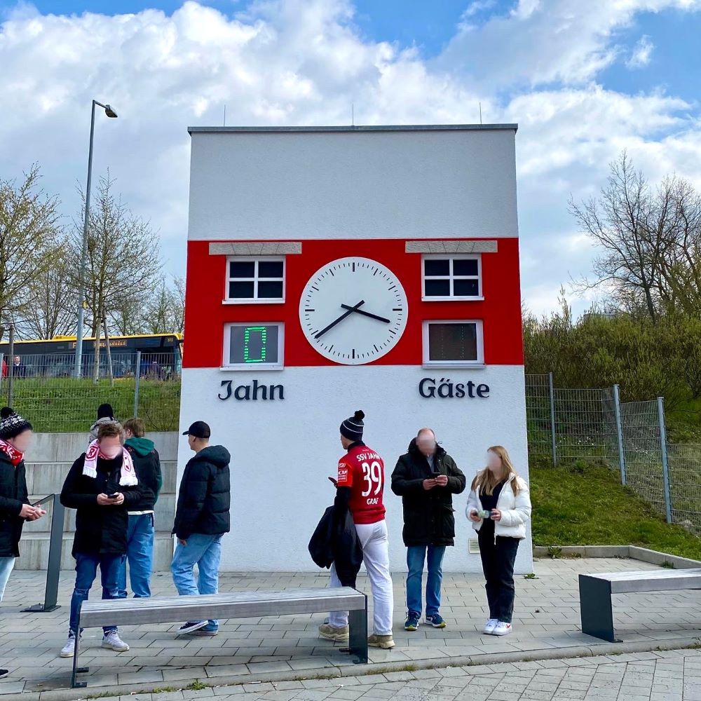 Nach dem Essen ging es vom Schloss zum wenige Meter entfernten Hauptbahnhof und von dort per Busshuttle zum rund 4 km südlich des Stadtkerns errichteten neuen Jahnstadion. Dies wurde am 18.Juli 2015 direkt an der A3 eröffnet und ersetzte seinerzeit das alte Jahnstadion von 1926, welches deutlich zentrumsnäher lag und fast 90 Jahre lang die Heimat der Jahn-Fußballer war. Allerdings waren die Ausbau- und Modernisierungsmöglichkeiten aufgrund der Lage in einem Wohngebiet begrenzt und deshalb musste ein Neubau auf der grünen Wiese her. Entstanden ist ein funktionaler Neubau für etwas über 15.000 Zuschauer, der auch den Anforderungen der 2.Bundesliga genügt (welcher der SSV Jahn seit 2017 wieder angehört). Für etwas Charme sorgen wenigstens Graffiti und ein Nachbau des charakteristischen Stadionturms des alten Jahnstadions.