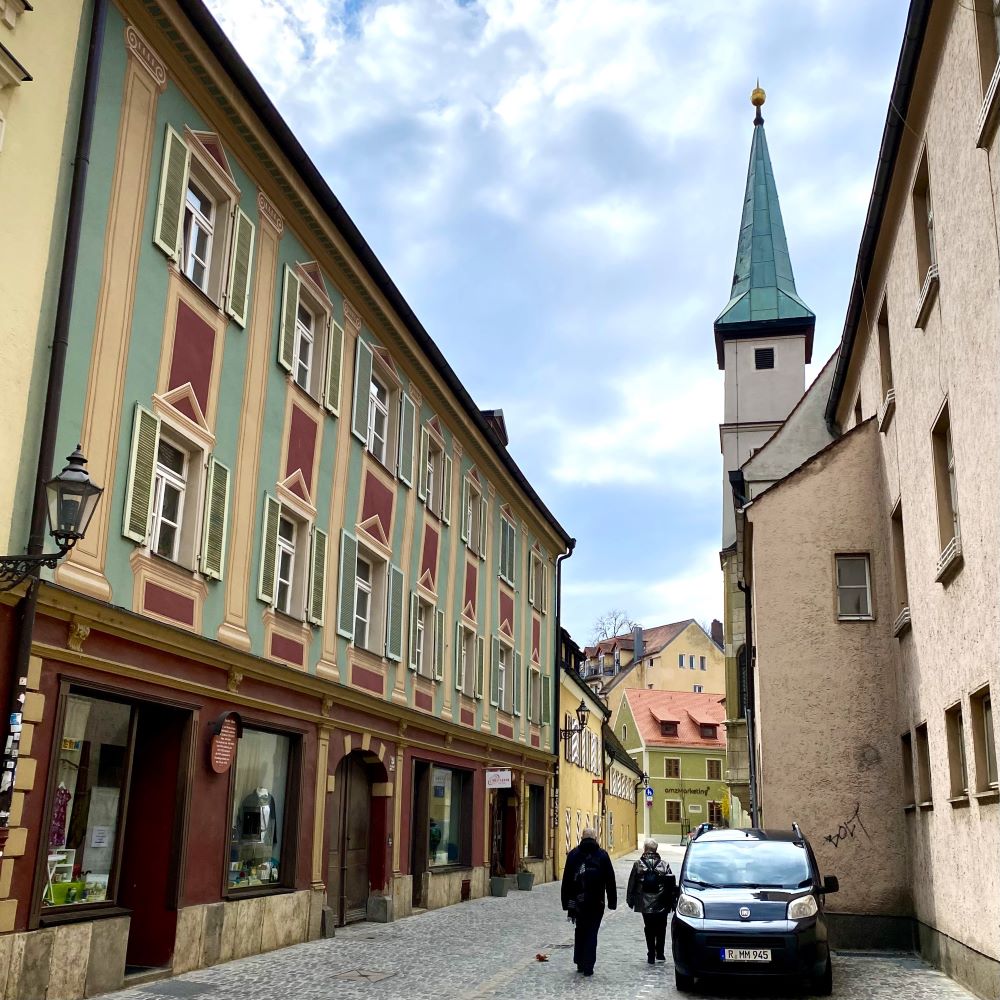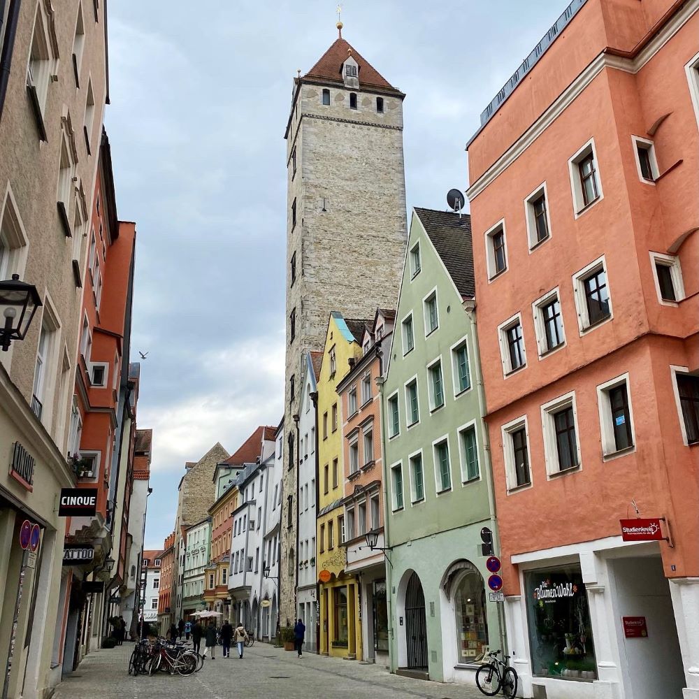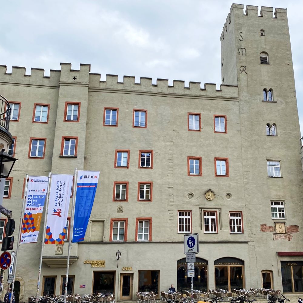 Nachdem ich den Neupfarrplatz begutachtet hatte, machte ich einen Spaziergang durch die Wahlenstraße. Hier findet man mit dem 50 m hohen Goldenen Turm (13.Jahrhundert) den höchsten Geschlechterturm nördlich der Alpen. Wie bereits im gestrigen Bericht aus Nürnberg erläutert (siehe Nürnberg 04/2023), bauten reiche Patrizierfamilien diese Türme als Statussymbol. Rund 100 Regensburger Patrizierfamilien waren im Mittelalter durch Fernhandel zu Reichtum und Einfluss gelangt. Die Oberhäupter dieser Familien bestimmten im Rat die Geschicke der Stadt und jede Familie hatte ihre eigene Stadtburg bzw. ihren eigenen Geschlechterturm. Da Regensburg seine Altstadt in den letzten Jahrhunderten städtebaulich relativ unangetastet ließ und auch der Zweite Weltkrieg die Bausubtanz weitgehend verschonte, sind übrigens noch stolze 20 mittelalterliche Geschlechtertürme in Regensburg erhalten.