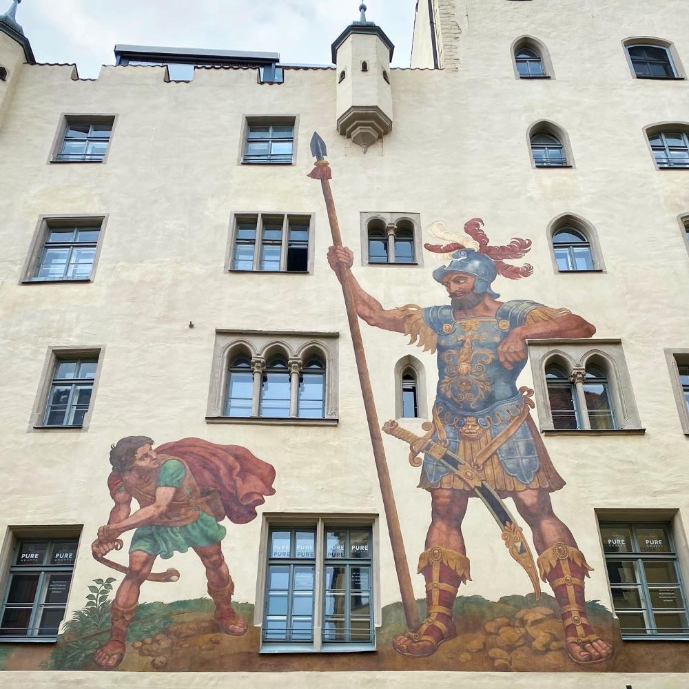 Al nächstes lagen die wesentlichen Sehenswürdigkeiten der Altstadt vor mir. Den Anfang machte dabei das Goliathhaus (13.Jahrhundert). Zwar leitet sich der Name des Hauses nicht von der biblischen Figur des Goliath, sondern von den Goliarden ab (umherziehende Kleriker des Mittelalters, denen ein Vorgängerbau des Goliathhauses in Regensburg als Herberge diente), dennoch zeigt seine Schaufassade ein 1573 erstmals entworfenes und seitdem mehrfach erneuertes Fresko des Kampfes zwischen David und Goliath. Ab 1290 war das Goliathhaus Stammsitz der Patrizierfamilie Thundorfer, was die repräsentative Baugestalt dieser Stadtburg erklärt.