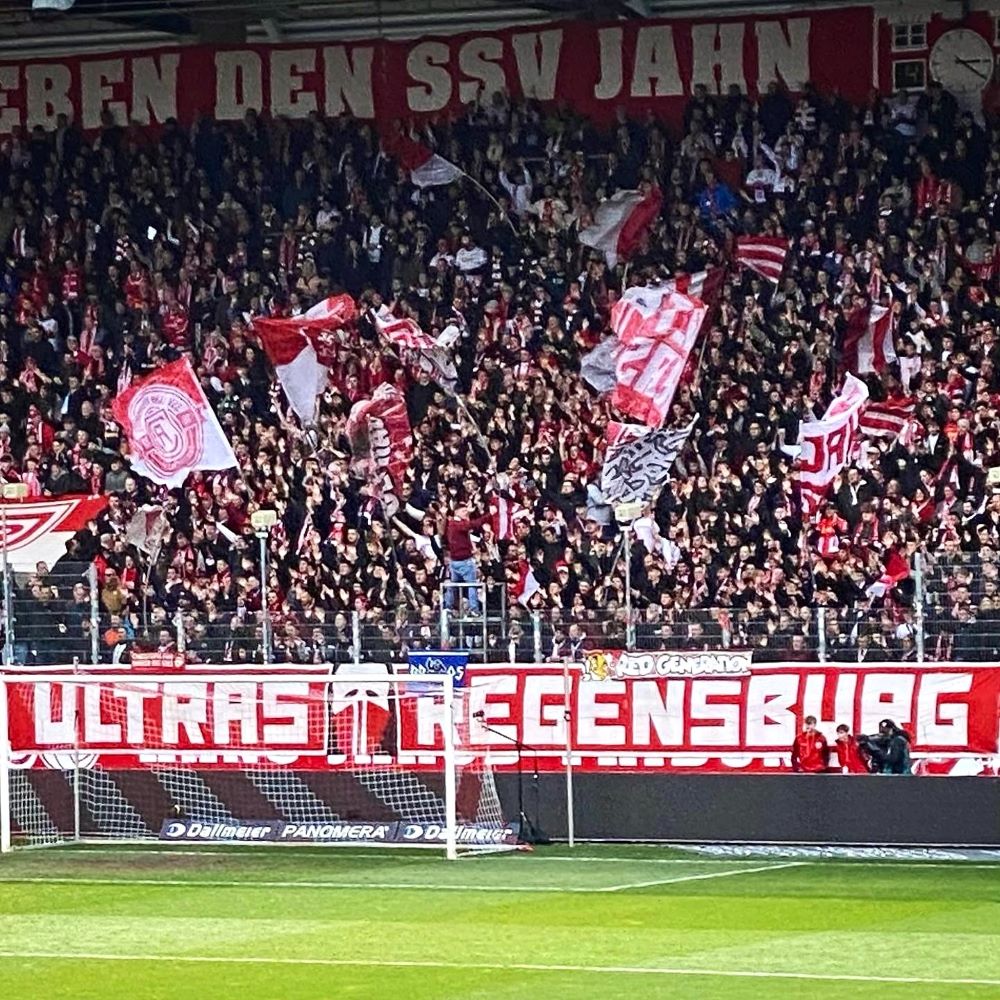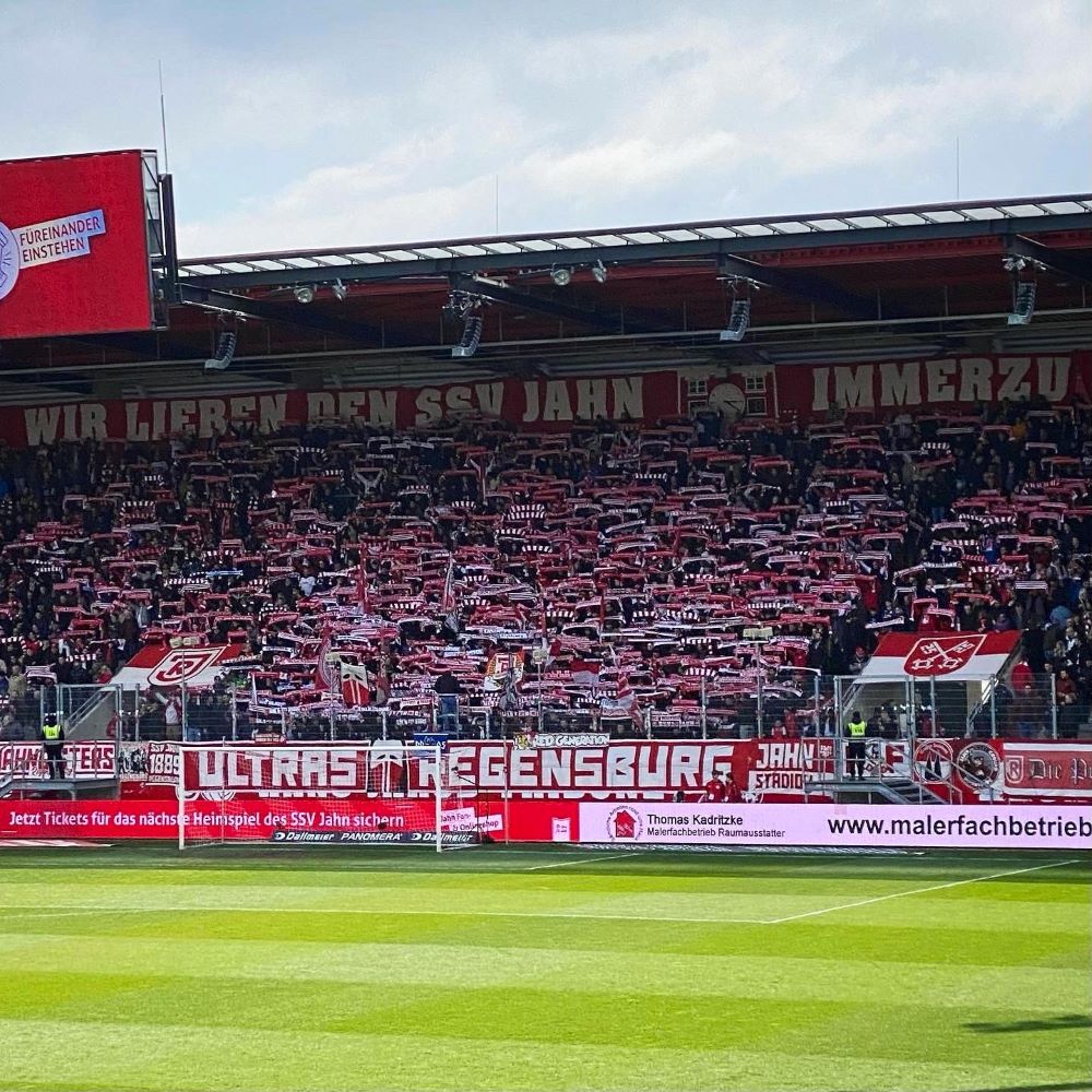 Das große Graffiti hinter der Hans-Jakob-Tribüne – auf welcher der harte Kern der Fanszene zuhause ist – wurde allerdings jüngst von Fans des SC Paderborn entstellt. Eine neue Eskalation der Rivalität zwischen den Ultras des SC Paderborn und des SSV Jahn Regensburg. Zum Glück war heute mit dem 1.FC Magdeburg ein aus Regensburger Sicht nicht ganz so brisanter Gegner angereist. Dazu sorgte die bayrische Polizei dafür, dass die 1.800 ostdeutschen Osterausflügler nicht zu viel Bewegungsfreiheit hatten. Auch die Einlasskontrollen waren wahrscheinlich penibel. Jedenfalls waren Block U & Co spät dran und schafften es nicht ihre kleine Choreographie pünktlich zum Anpfiff fertig vorzubereiten.