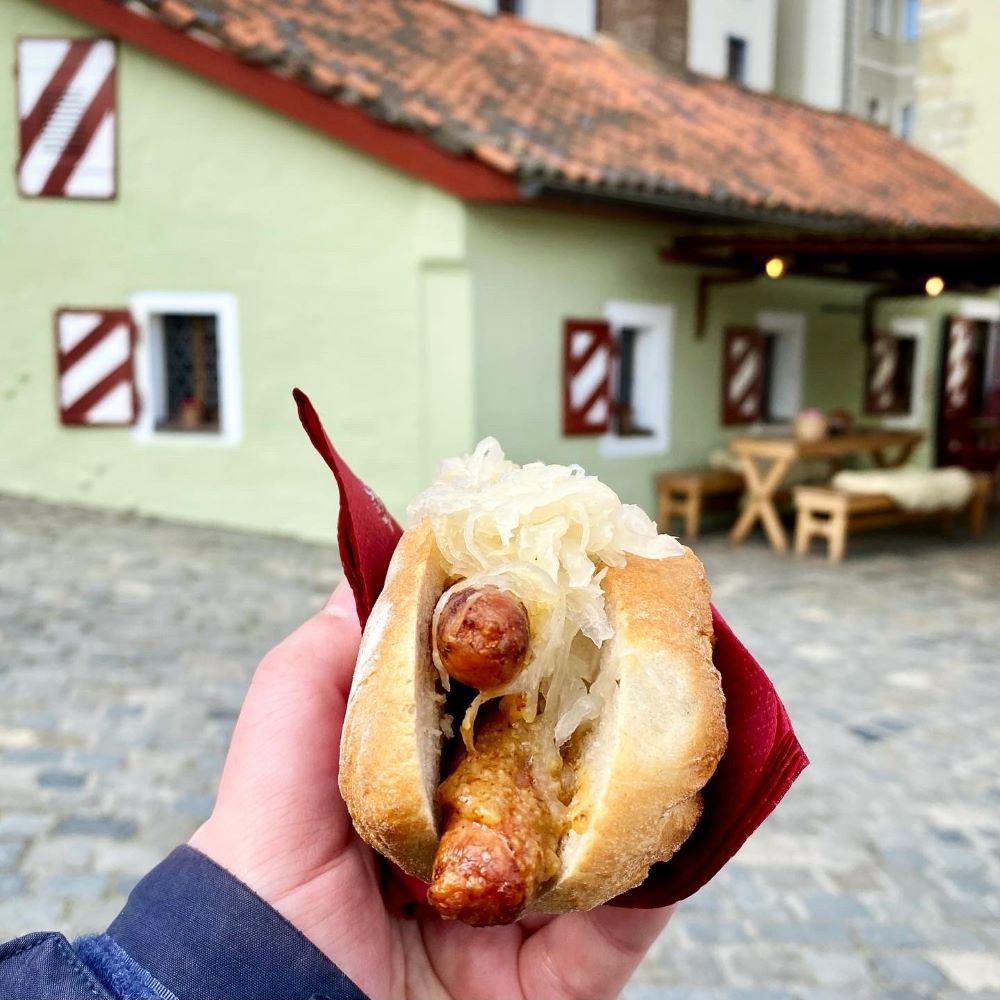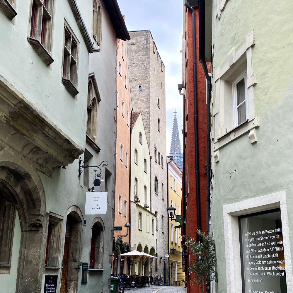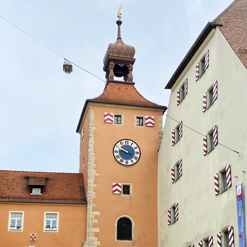 Mein neuerlicher Zugang zur Altstadt wurde am Südende der Steinernen Brücke der Brückturm aus dem 13.Jahrhundert. Dieser bildet mit dem Salzstadel – zwischen 1616 und 1620 errichtet und heute Heimat des Besucherzentrums Welterbe Regensburg – und dem Amberger Stadl (1487) ein schönes Ensemble. Ferner findet man im Schatten des Brückturms die weltweit älteste Wurstbräterei. Die historische Wurstkuchl soll bereits im 12.Jahrhundert die Bauarbeiter der Steinernen Brücke mit den nötigen Kalorien versorgt haben.