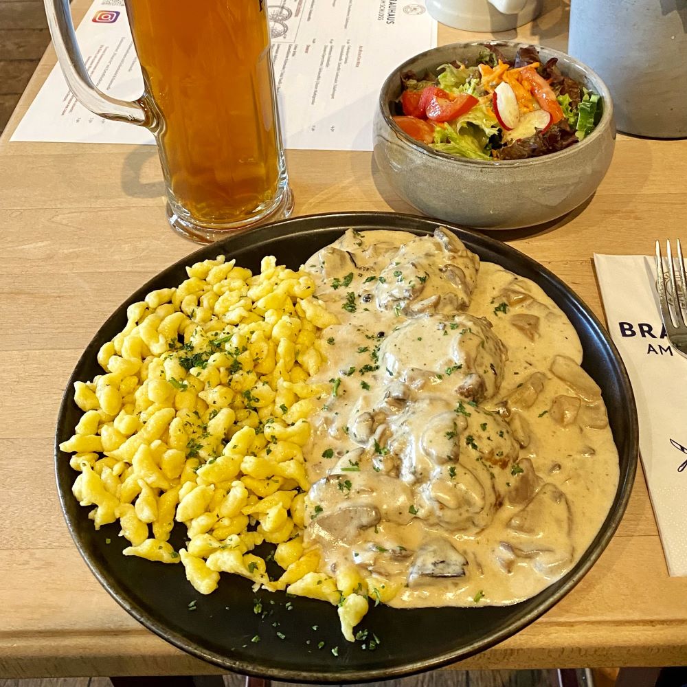Stattdessen schaute ich mir die frei zugängliche Basilika St. Emmeram an. Die einstige und ursprünglich frühromanische Klosterkirche wurde im 18.Jahrhundert von den Brüdern Cosmas Damian und Egid Quirin Asam im Stile des Barock völlig neugestaltet und bewahrt in ihrer Krypta u. a. die Gebeine des Heiligen St. Emmeram auf. Außerdem fand ich im Marstall des Schlosses das Brauhaus am Schloss vor. Da es mittlerweile 12 Uhr war, kam mir dieser Untermieter von Frau von Thurn und Taxis ganz gelegen für ein Mittagessen. Drei Wildfleischpflanzerl vom Hirsch mit Waldpilzrahm, Eierspätzle und einem gemischten Salat (16,90 €) ließ ich mir zusammen mit einem halben Liter des hausgebrauten Bieres St. Emmeram Hell (4,50 €) auftischen.
