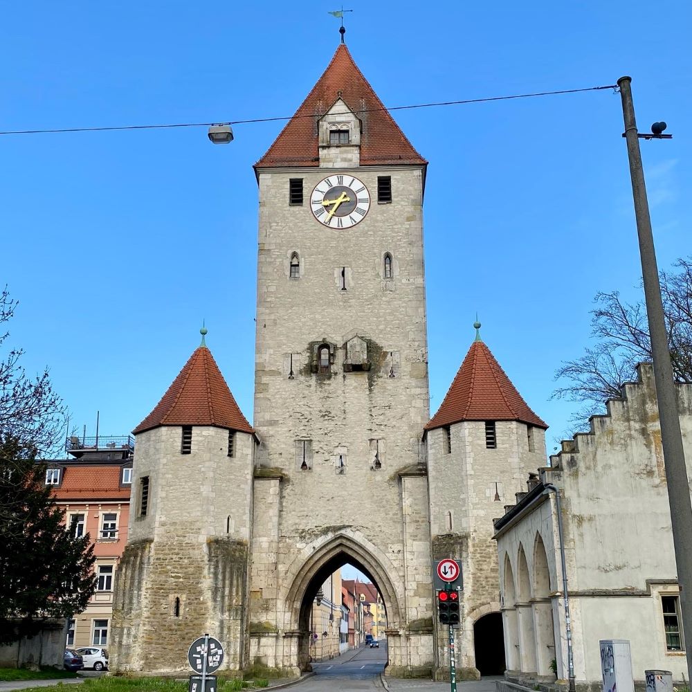 Mein historischer Stadtspaziergang führte mich jedoch zunächst einmal zu einer Toranlage aus dem Mittelalter. Das ab 1284 entstandene Ostentor am Ostrand der Altstadt war einer von sechs Tortürmen der ehemaligen Stadtbefestigung und zählt heute zu den besterhaltenen gotischen Stadttoren Deutschlands. Das fünfgeschossige Bauwerk entstand über der östlich nach Wien führenden mittelalterlichen Straße und war somit das Stadttor, durch das die meist aus Wien kommenden Kaiser zum Immerwährender Reichstag zu Regensburg jahrhundertelang in die Stadt einzogen.
