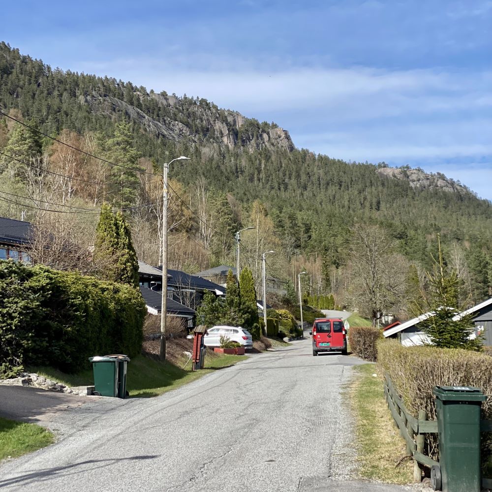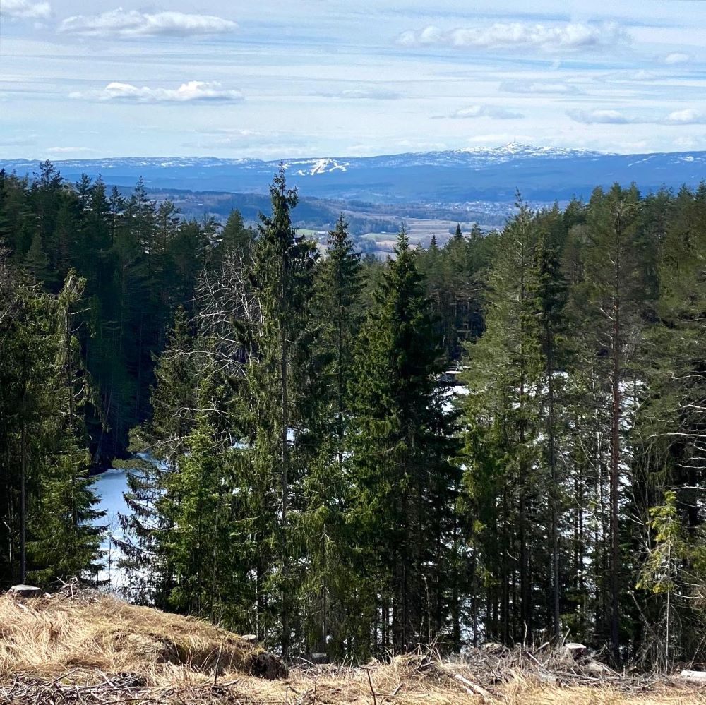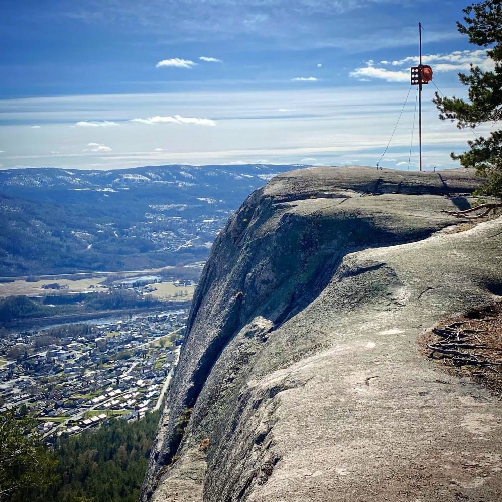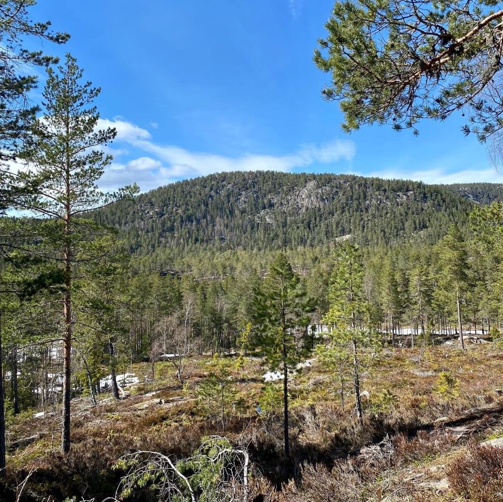 Der Berg Knabben im Landschaftsschutzgebiet Solbergfjellet soll auf 368 m ü. NN angeblich eine tolle Aussicht über das Tal des Flusses Drammenselva und den Drammensfjorden, einen Nebenarm des Oslofjordes, bieten. Also auf Komoot einen Rundweg vom Bahnhof Mjøndalen ausbaldowert und gegen 12 Uhr losmarschiert.