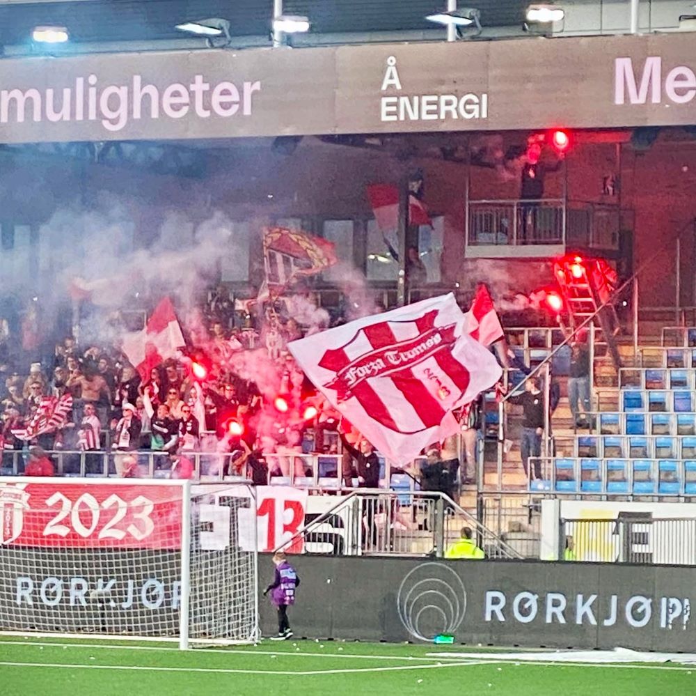Dennoch reicht der Palmarès für eine nennenswerte Anhängerschaft. Die sangesfreudigsten Fans von Godset hatten sich hinter dem Tor versammelt, aber ein Torschrei war ihnen heute nicht vergönnt. Stattdessen schoss Tromsøs erst vier Minuten zuvor eingewechselter Linksaußen Yaw Paintsil in der 73.Minute das einzige Tor des Abends. Große Freude im Block der Tromsøværinger, die wieder ein paar rote Fackeln entzündeten und nach dem Treffer nochmal richtig auftauten. Ein gutes Dutzend supportete in der Schlussviertelstunde nun sogar oberkörperfrei. Dass manch einer bei 13,12° C bereits mit kurzen Ärmeln und kurzen Hosenbeinen unterwegs war, will ich auch nicht unterschlagen. In Norwegen ging das heute schon als Frühsommer durch.