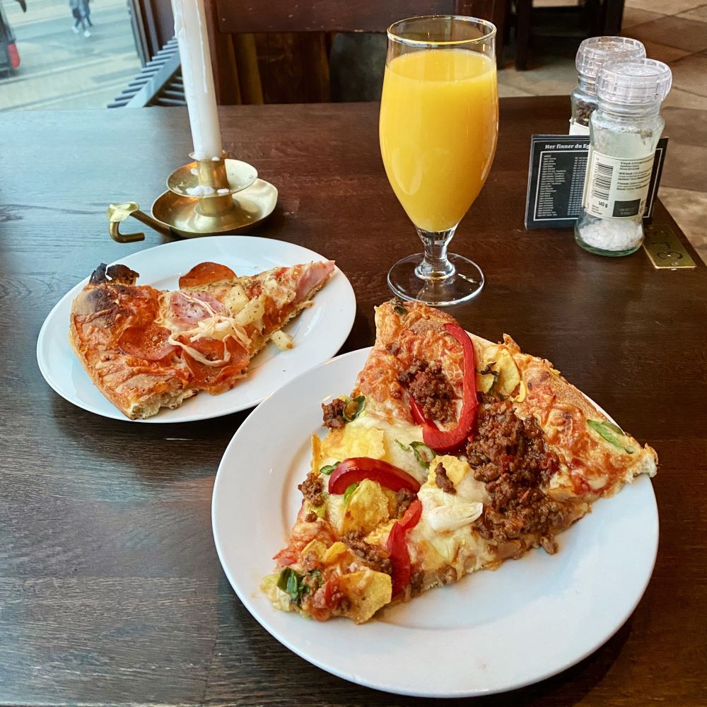 Der nächste Egon war direkt an der Sentralstasjon und somit nur 350 m von meinem Hotel entfernt. Zwar musste man um 20:30 Uhr draußen Schlange stehen, aber nach einer guten Viertelstunde hatte ich die Pole Position inne und bekam den nächsten freien Tisch. Zum Buffetangebot wurde noch ein Orangensaft geordert, so dass die Kreditkarte letztlich mit 198 NOK (16,97 €) belastet wurde. Im Gegenzug spazierte ich viermal mit je zwei kleinen Tellern zum Buffet. Der Salat war ein Witz (lediglich eine Box mit Blattsalat und ein Trog mit Dressing), aber immerhin fünf Pizzen standen zur Auswahl. Ich probierte sie alle (Hawaii, Tex-Mex, Bolognese, Verdura und Speciale) und war anschließend pappsatt. Es war wenig überraschend nicht die beste Pizza meines Lebens und wird wohl auch nicht die beste Pizza Oslos sein, aber das Preis-Leistungsverhältnis war ansprechend.