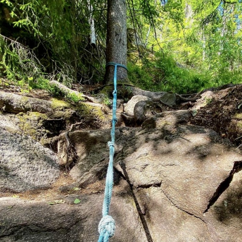 Nach 20 Minuten des Rastens und Genießens, zeigte die Uhr bereits 15 Uhr an. Tja, den geplanten Zug um 16:06 Uhr von Mjøndalen nach Drammen konnte ich wohl knicken. Zumal der Abstieg vom Knabben auf der dem Tal der Drammenselva zuwandten Seite herausfordernder als gedacht wurde. Klar, die App zeigte Passagen mit 20 % bis 25 % Gefälle an. Doch dass der Weg plötzlich an einer Felskante endete, war nicht zu erahnen. Aber ich war nicht vom richtigen Pfad abgekommen, sondern hier musste man sich eben abseilen.