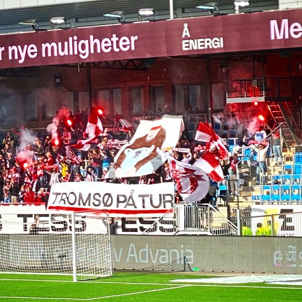 Ungefähr 200 Fans waren auf Tour gegangen, um ihren Herzensverein Tromsø IL im rund 1.700 km entfernten Drammen zu unterstützen. Das ist eine Entfernung wie von Hannover nach Neapel und zu 96 % wird die An- und Abreise der Fans per Flugzeug erfolgt sein. Aber Respekt, falls jemand mit seinem Elektroauto einen emissionsarmen 3-Tages-Trip daraus gemacht hat. Da Alta IF mittlerweile nur noch drittklassig kickt, darf sich Tromsø IL damit rühmen der nördlichste Profifußballclub der Welt zu sein (Tromsø liegt 344 km nördlich des Polarkreises) und schlägt sich trotz eines gewissen Standortnachteils ziemlich erfolgreich.