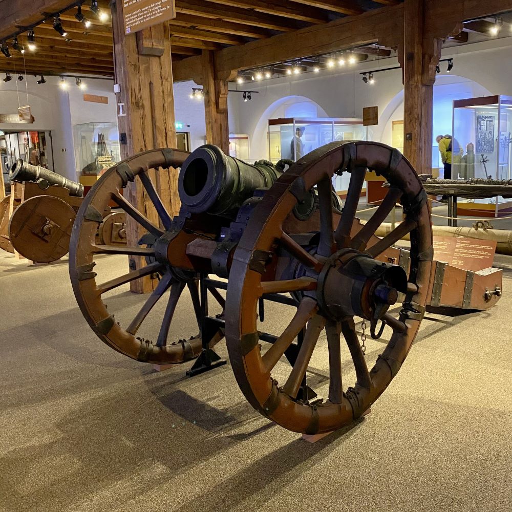 Vom Hotel bedurfte es zu diesem militärgeschichtlichen Museum lediglich eines knapp zehnminütigen Spaziergangs und für 100 NOK (ca. 8,50 €) bekam ich Zutritt. Ich arbeitete mich nun von den Raub- und Eroberungszügen der Wikingerzeit bis zu den Kriegen der jüngeren Vergangenheit vor. Dabei konnte ich die bereits am Vortag gestreiften norwegischen Einigungsprozesse unter König Harald I. Schönhaar (* 852; † 933) und die Expansion der norwegischen Wikinger nach Island, Grönland und den Färöer nochmal vertiefen. Auch auf die mittelalterlichen Burgen und Festungen Norwegens geht das Museum mit anschaulichen Modellen ein. Ein noch größerer Schwerpunkt wird jedoch auf die Frühe Neuzeit gelegt, als Norwegen prinzipiell ein Vasallenstaat Dänemarks war und dem dänischen König Soldaten und Schiffe für dessen Kriege stellen musste.