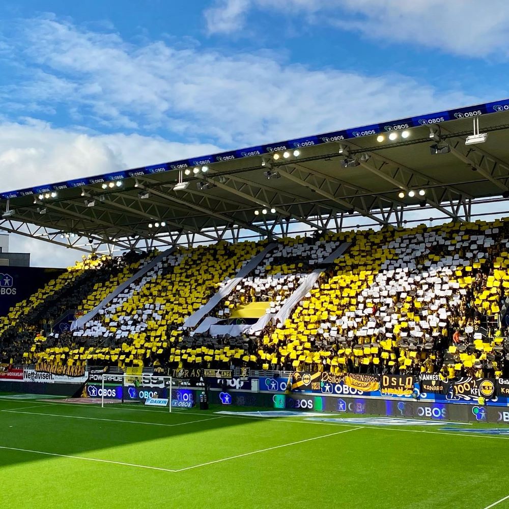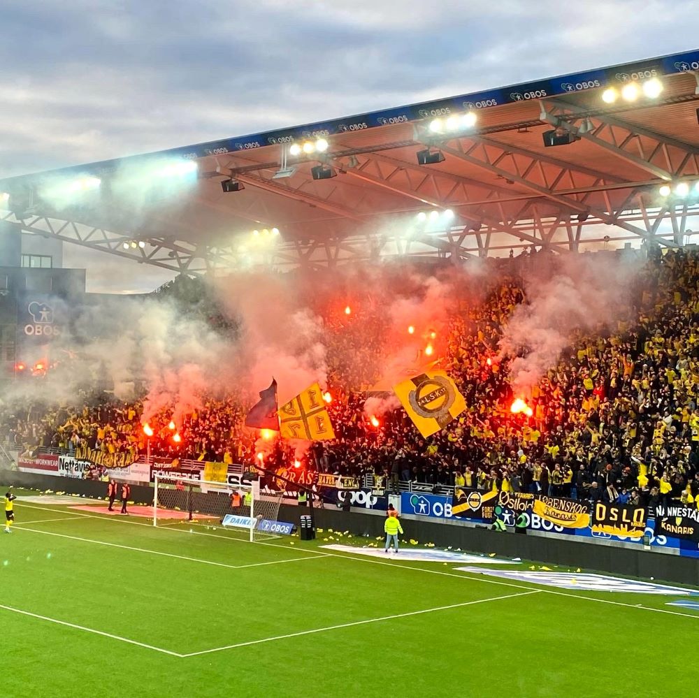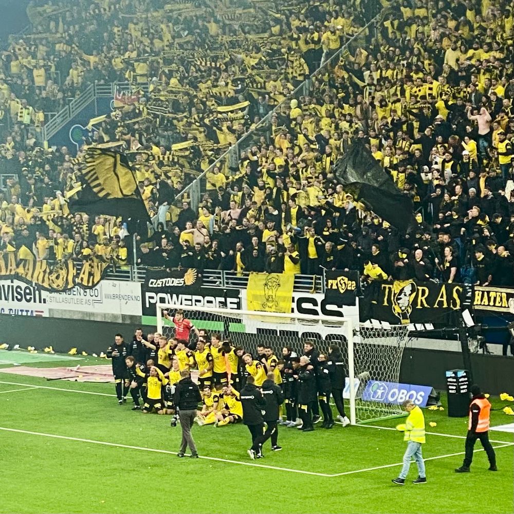 Außerdem hatte man für den Fall eines Derbysiegs noch eine Blockfahne im Gepäck. Inspiriert von den Looney Tunes, hatte darauf der gelbe Kanarienvogel Tweety den Kater Sylvester niedergestreckt. Als die Blockfahne wieder eingerollt war, wollte und sollte die Mannschaft nochmal ein ikonisches Erinnerungsfoto vor der Gästekurve schießen. Dieser Abend wird sich bei Spielern und Fans buchstäblich eingebrannt haben. Ein Spiel, ohne welches in Zukunft kein Vorbericht über dieses wahrscheinlich derzeit heißeste Derby Norwegens auskommen wird.
